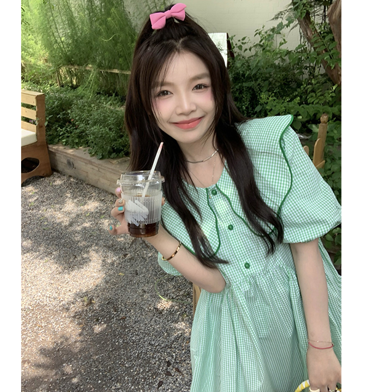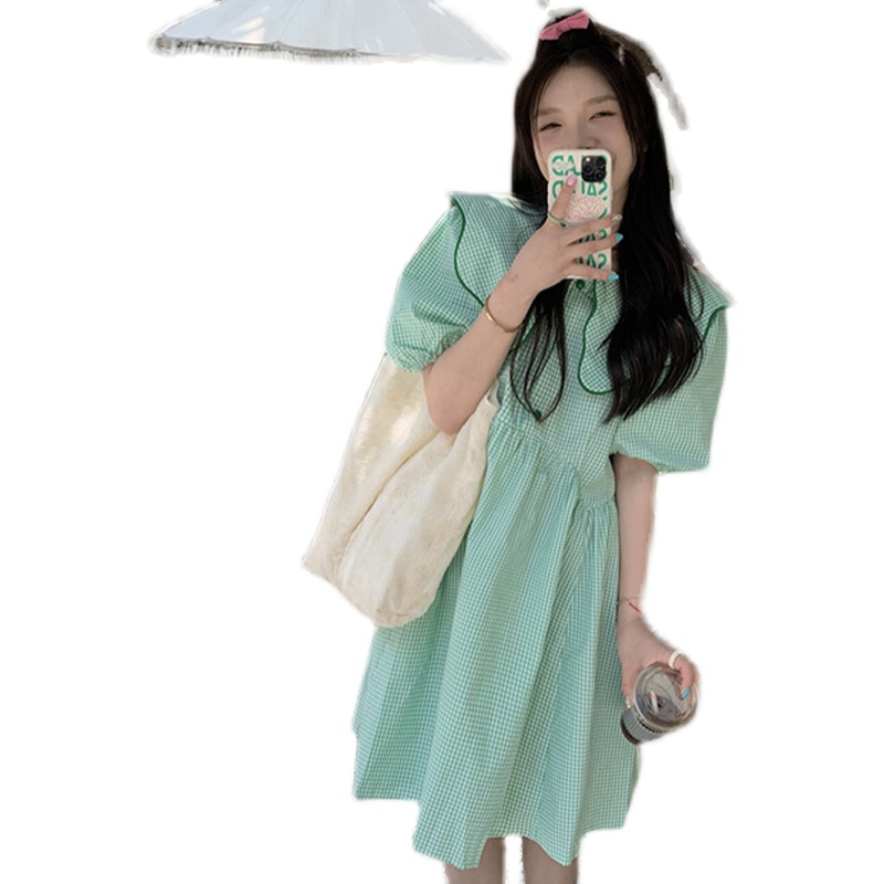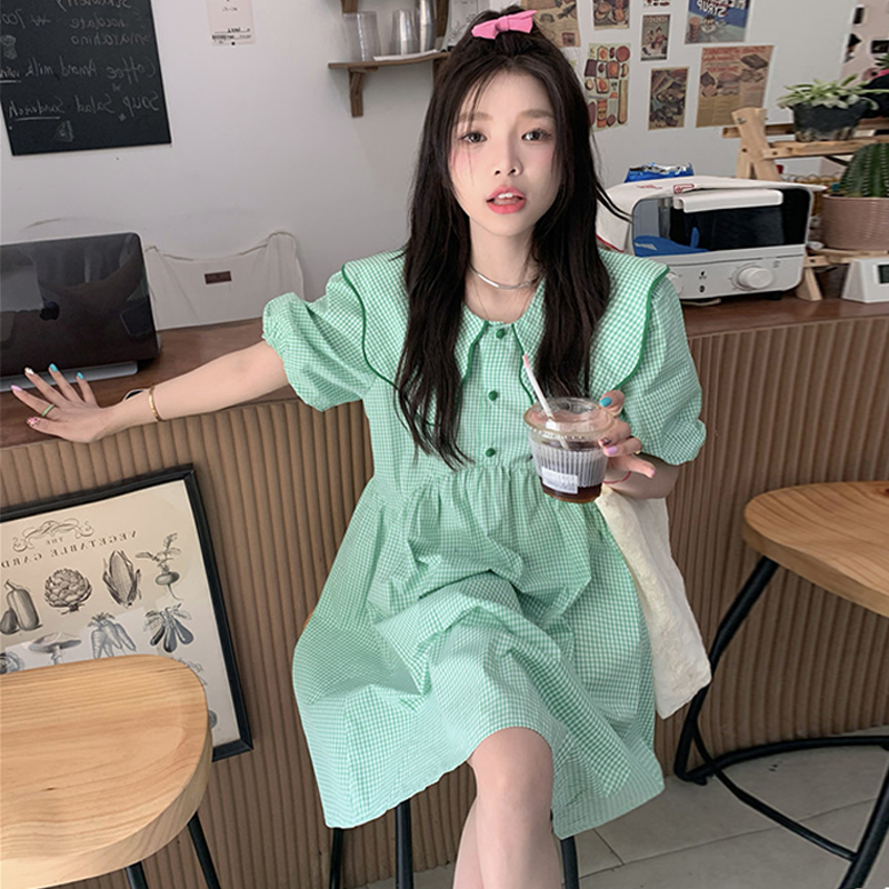 大码女装胖mm清纯裙子韩版娃娃领泡泡袖少女甜美减龄格子连衣裙夏
