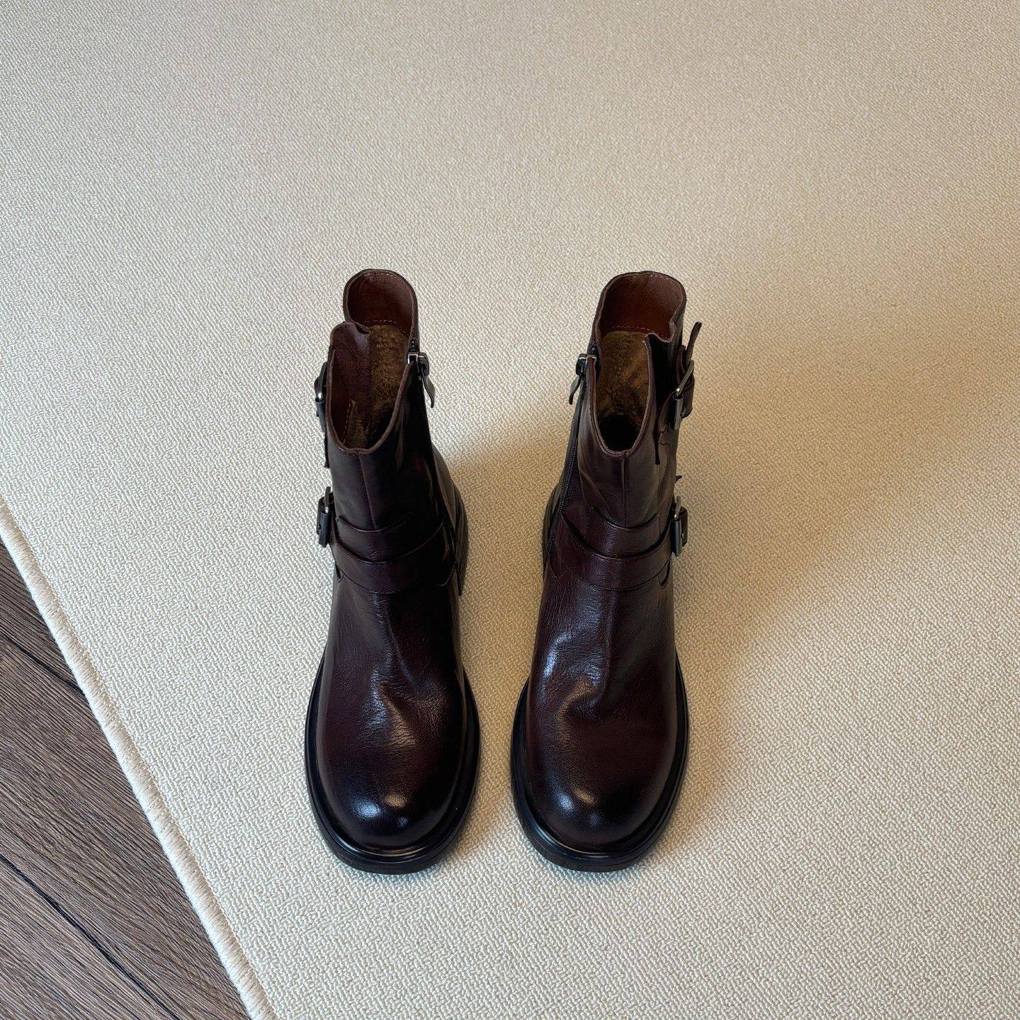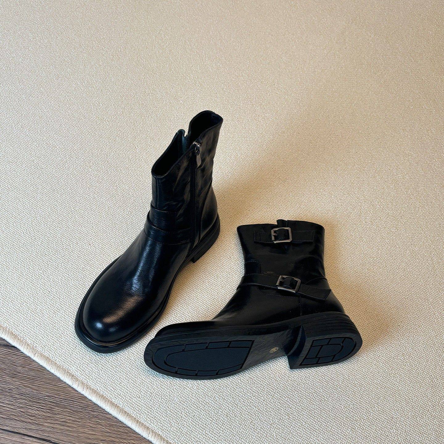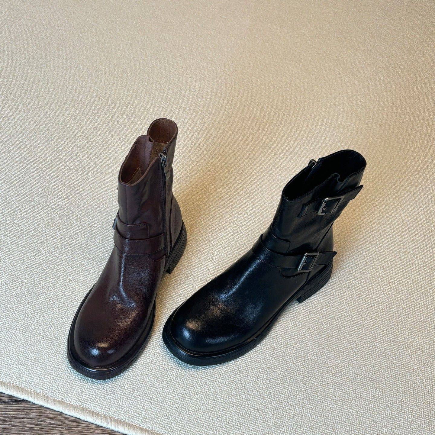 真皮英伦风皮带扣马丁靴女侧拉链2025新款秋冬西部牛仔靴圆头短靴