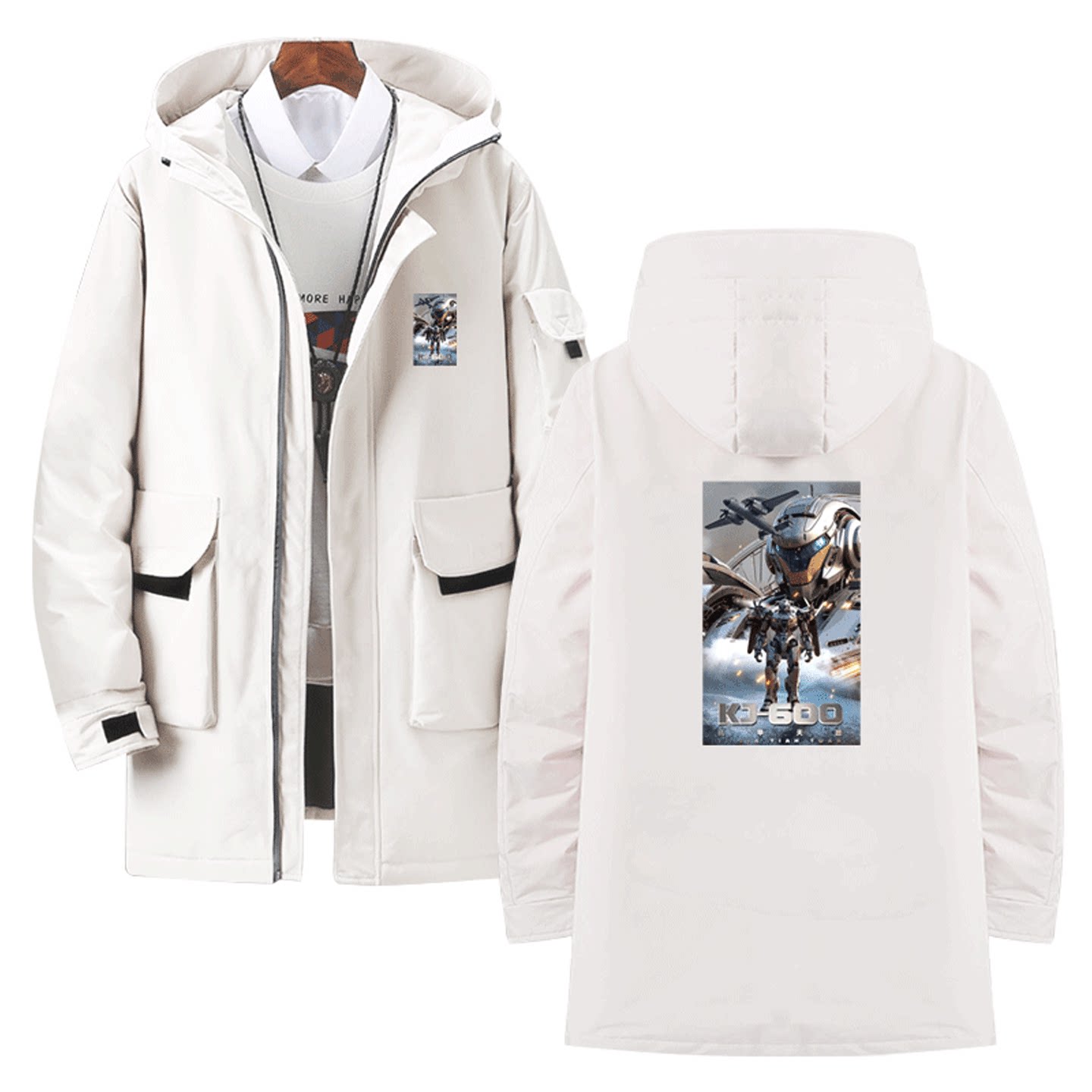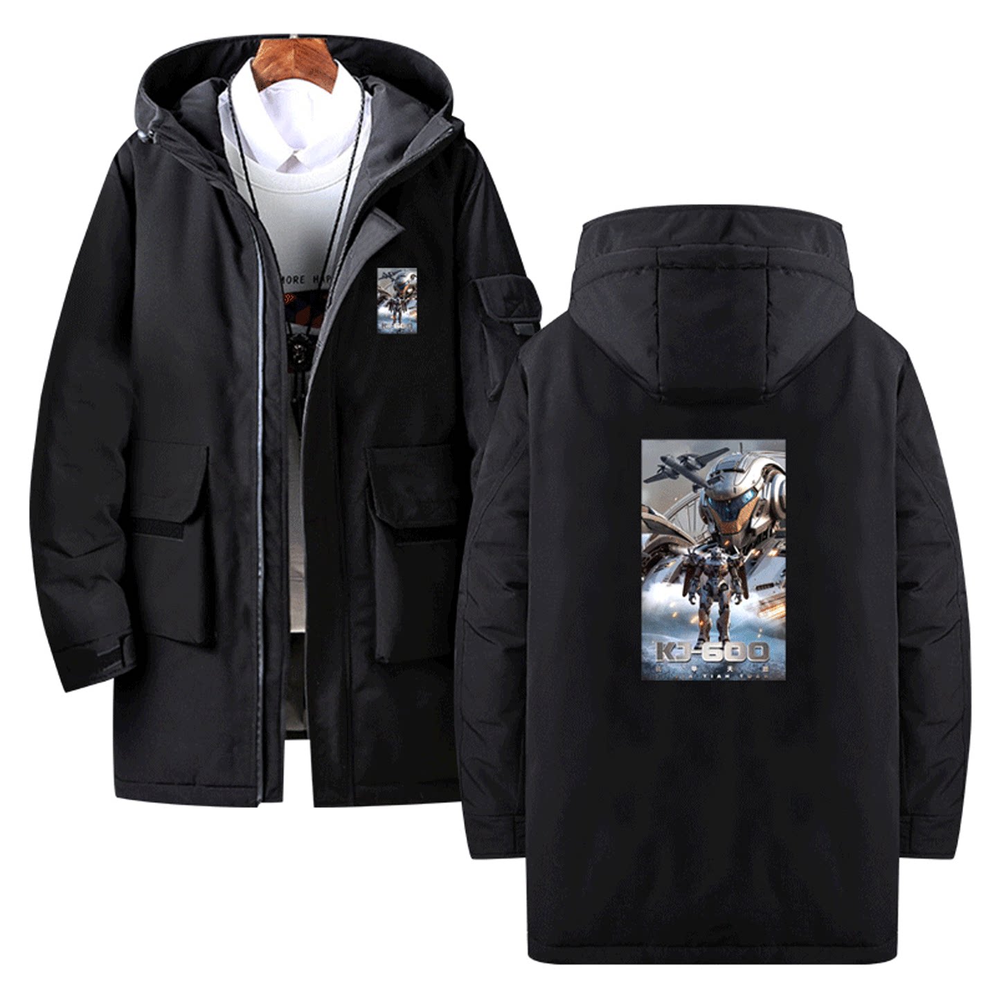国潮动漫机甲纪元KJ-600变形战术机甲千里眼男女定制中长款羽绒服