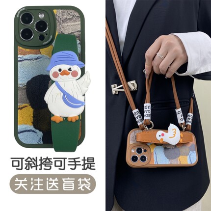 腕带油画鸭苹果15promax斜挎iphone14手机壳plus适用mini硅13胶12防11摔x新s款r女e高7级p感g情侣max时8尚6