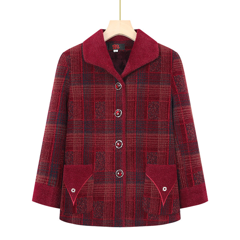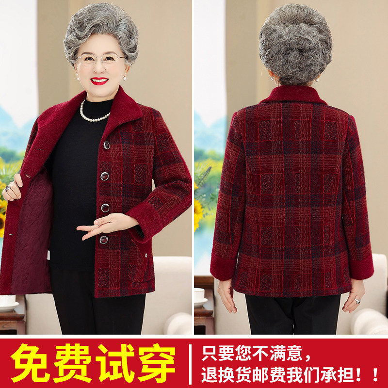 中老年人秋冬外套女妈妈装加绒加厚格子上衣奶奶装水貂绒大码毛呢
