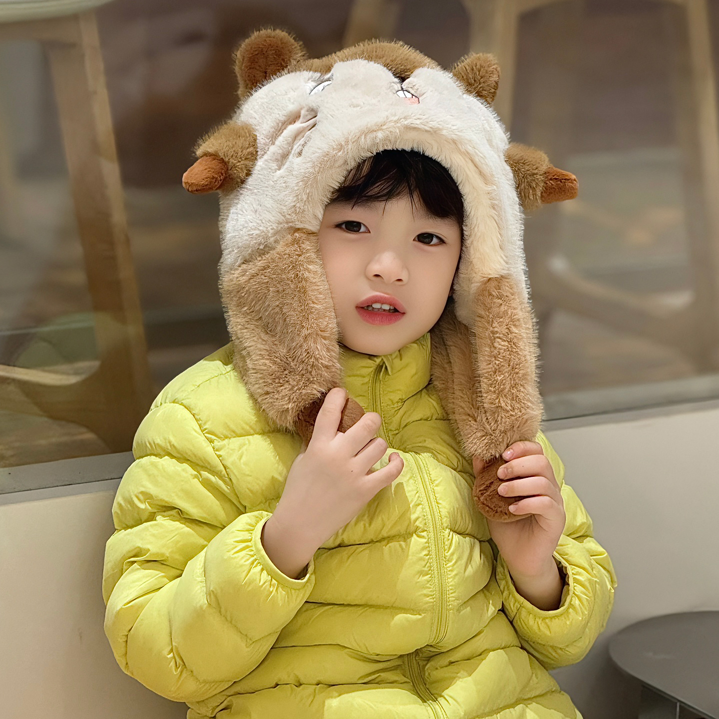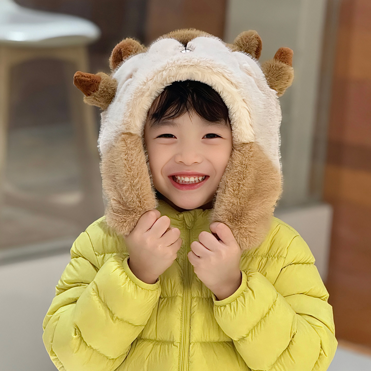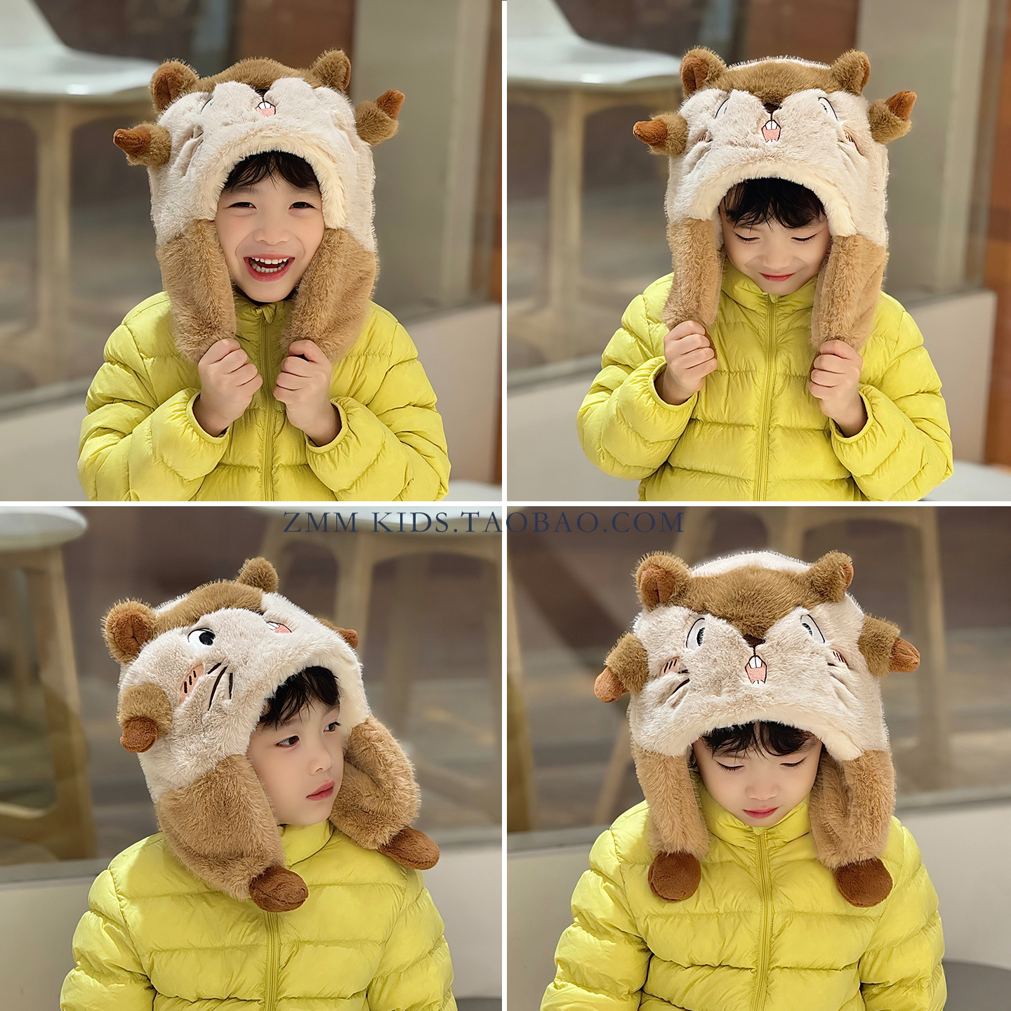 土拨鼠帽子儿童围巾一体捏耳朵会动的2025新款冬季冬款小男孩冬天