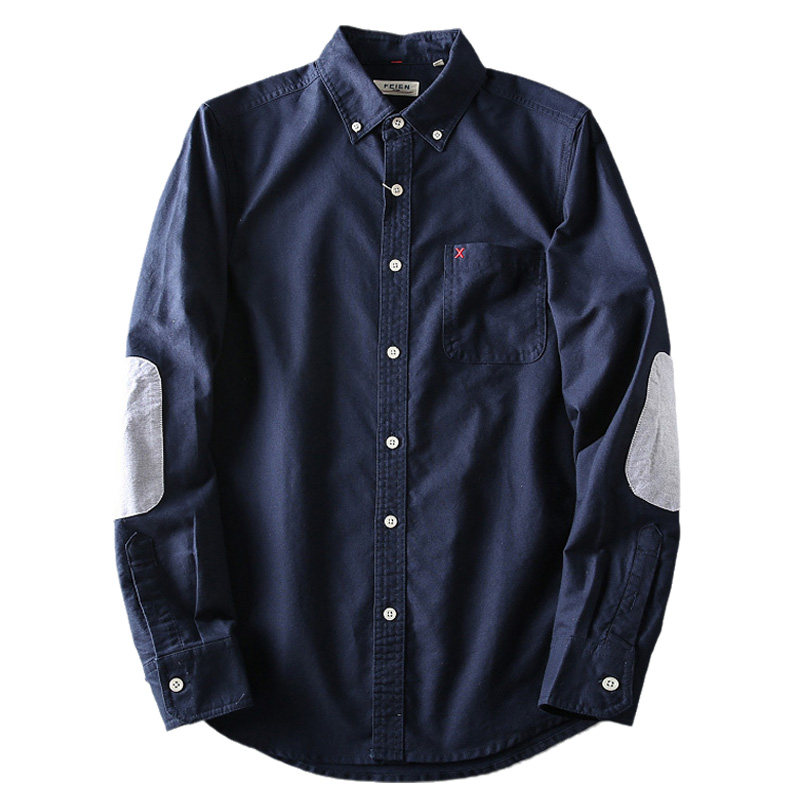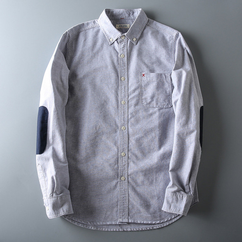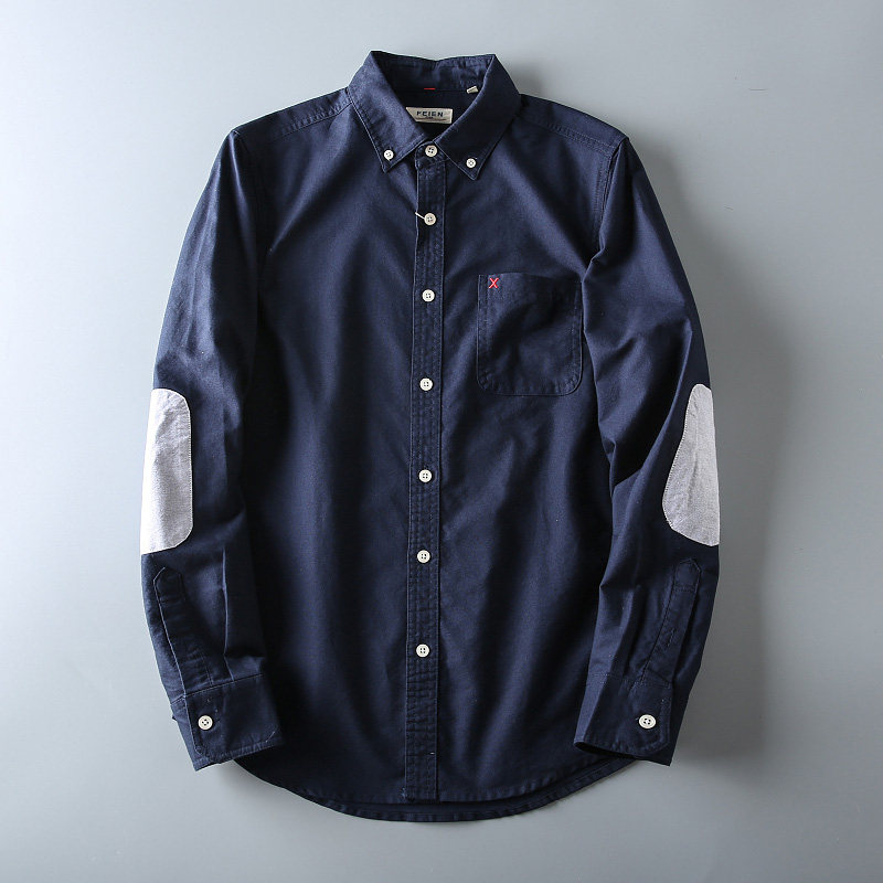 秋季新款 手肘贴布补丁 全棉水洗牛津纺男士修身休闲百搭衬衫衬衣