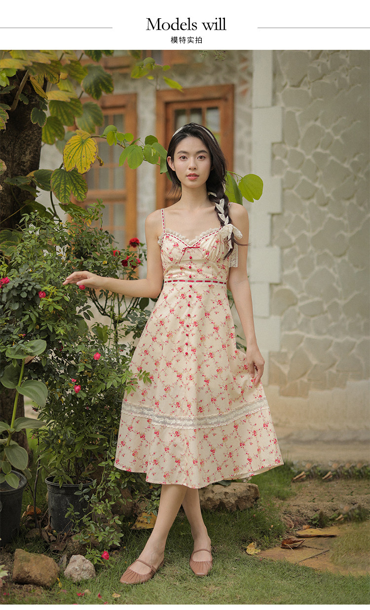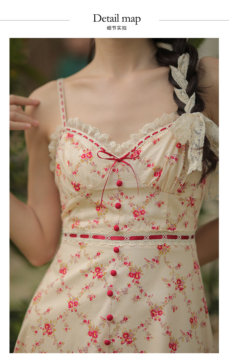 奈良nalen裙子红石榴法式棉制田园风蕾丝印花甜美浪漫连衣裙2025
