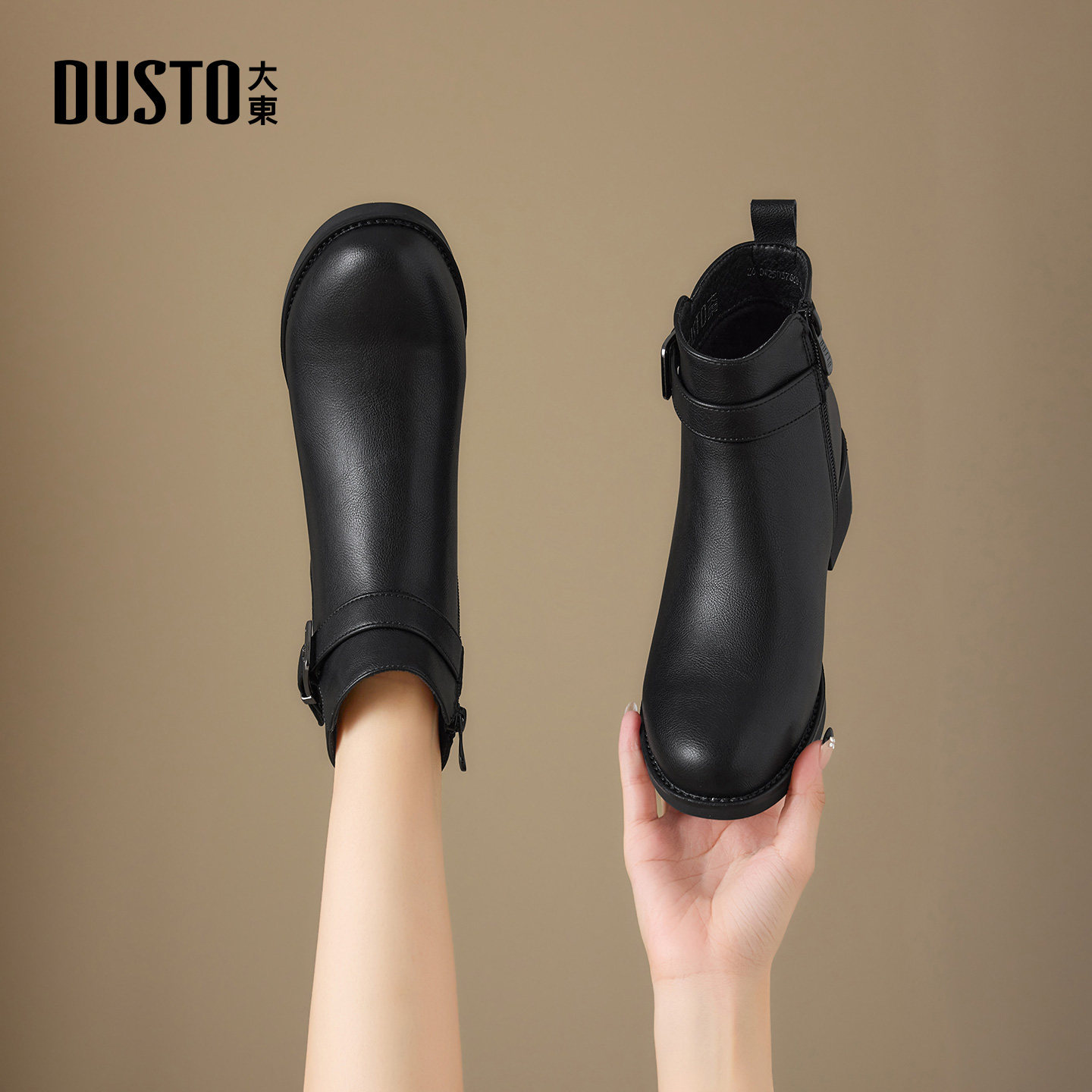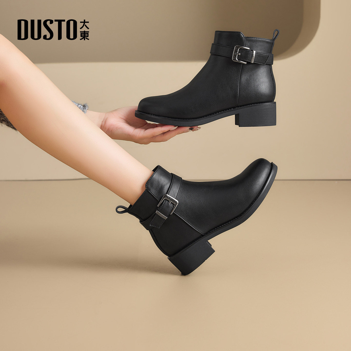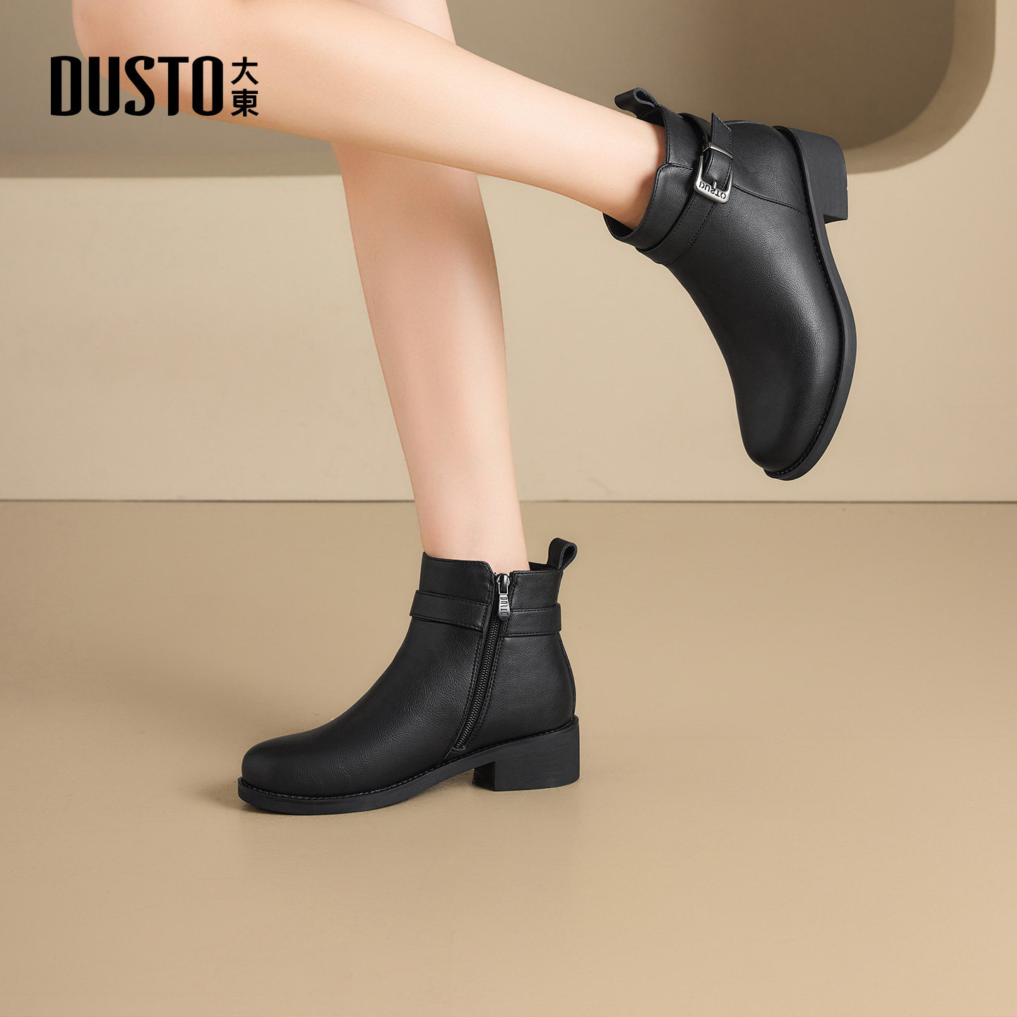 大东女鞋2025冬季新款时尚粗跟妈妈靴短筒侧拉链女靴百搭通勤靴子