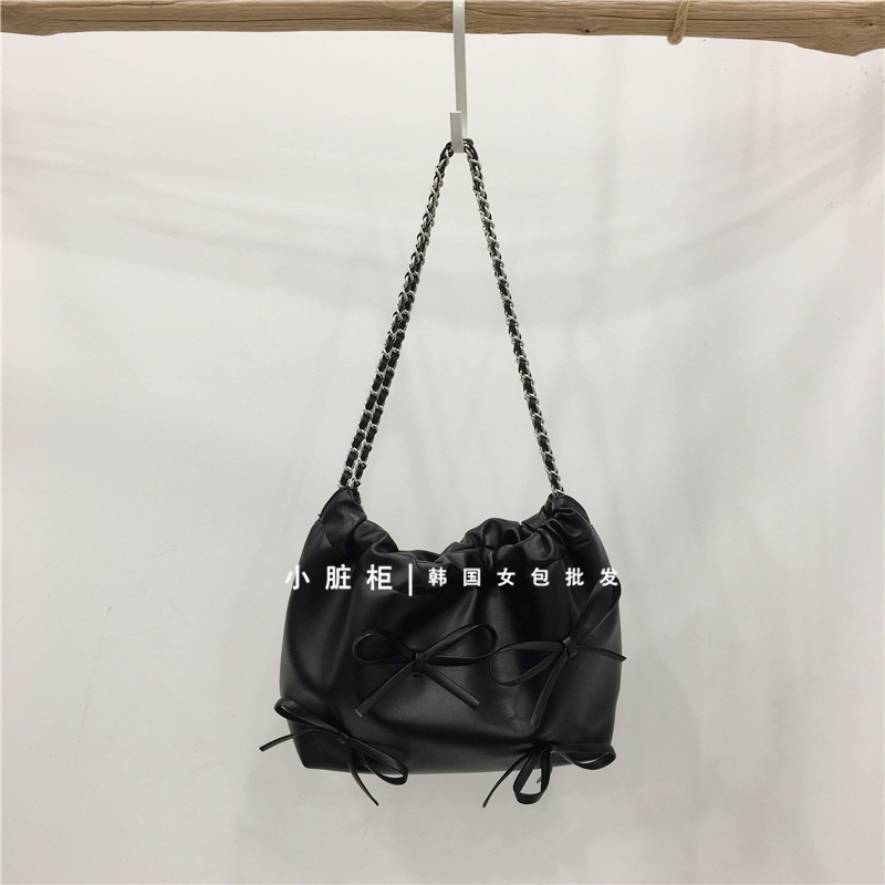 小脏柜 高级感小众时尚垃圾袋链条蝴蝶结银色软皮包包单肩托特包