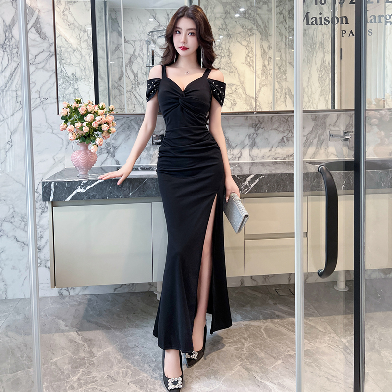 晚礼服长裙性感低胸露肩一字肩修身显瘦包臀红色连衣裙夜场工作服