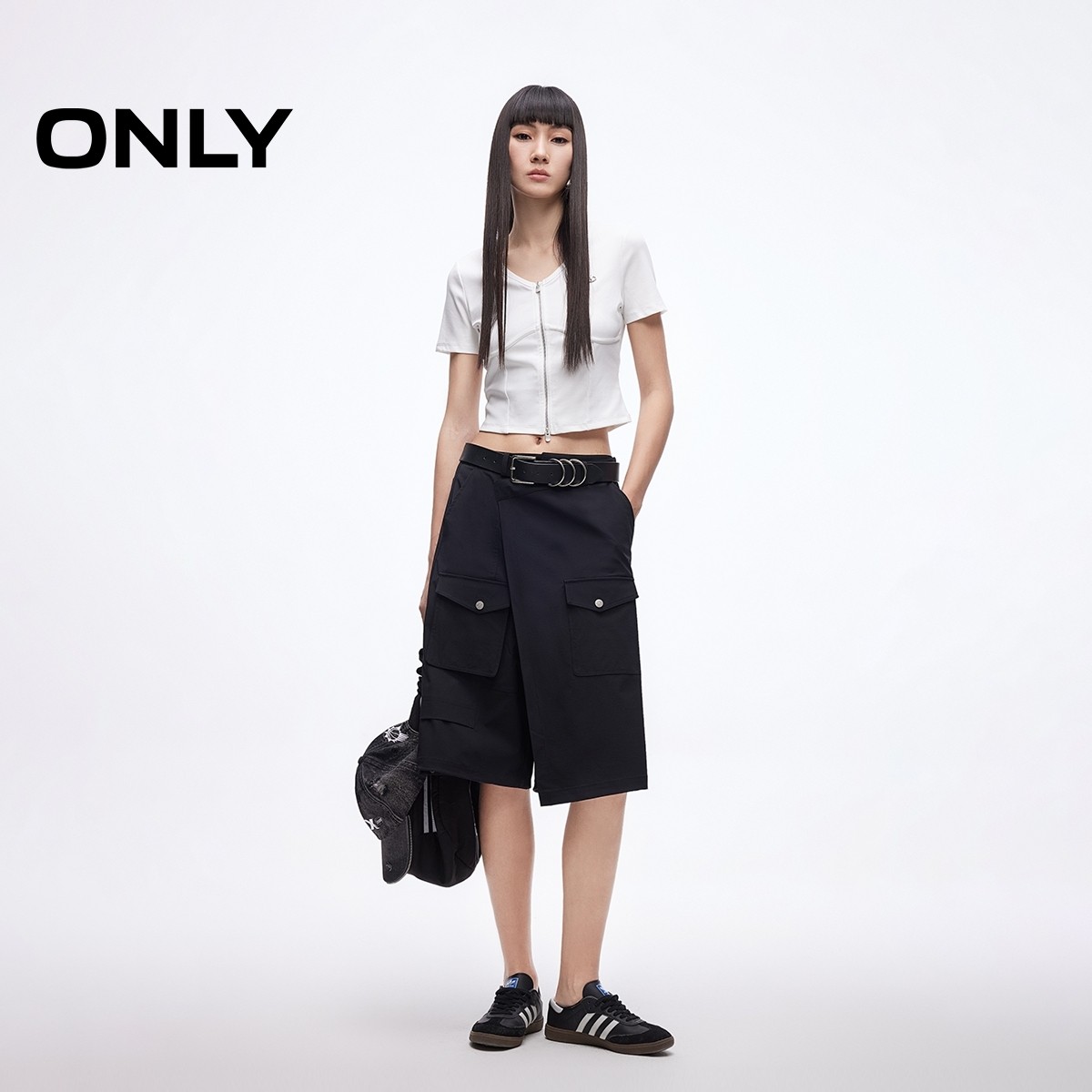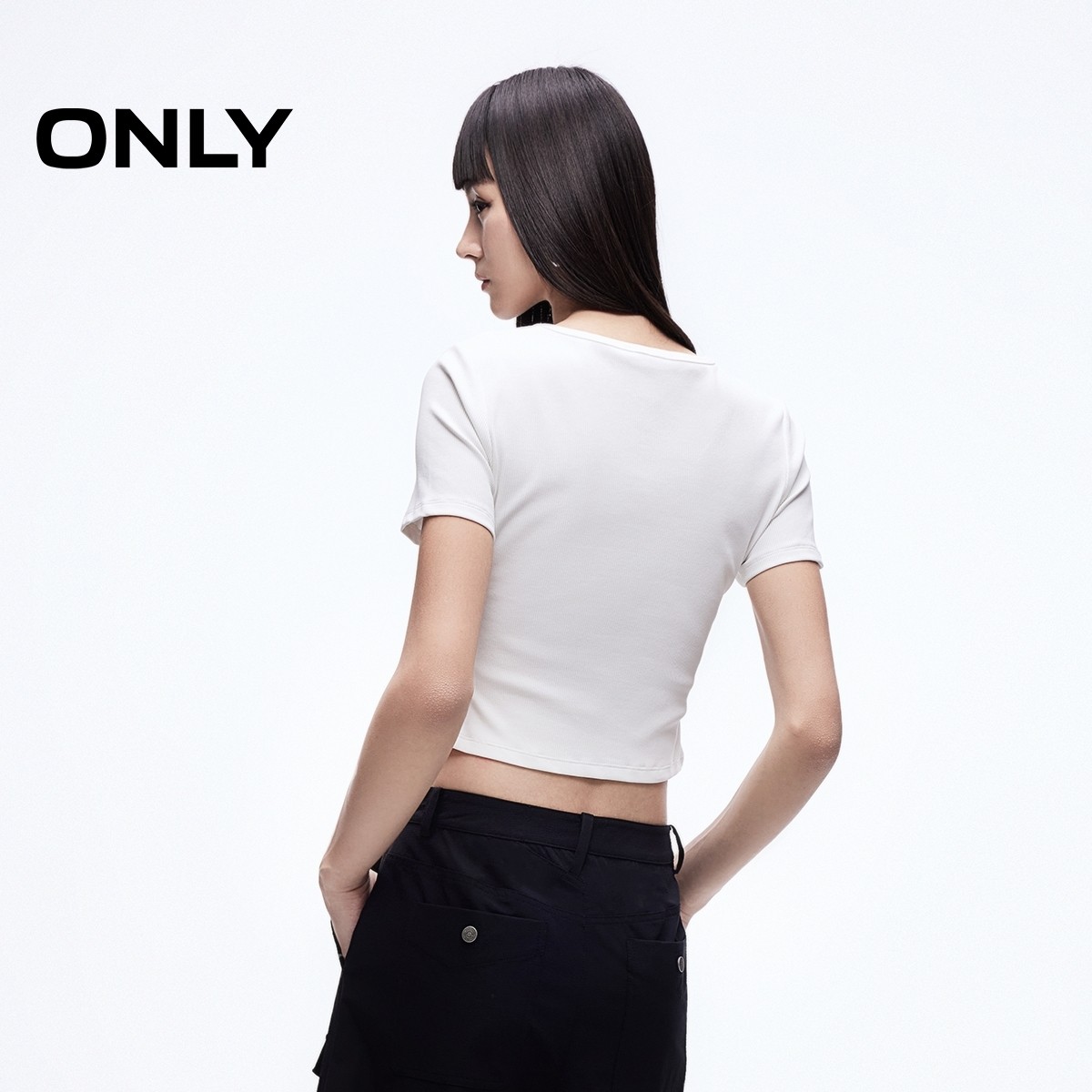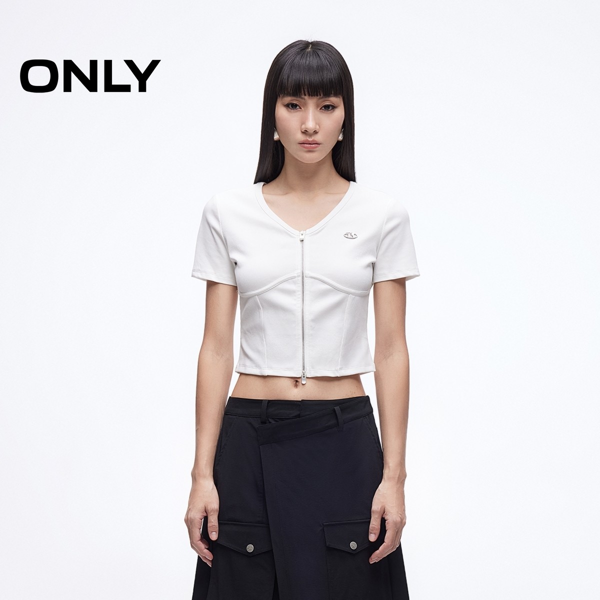 ONLY2025夏季新款双头拉链V领剪裁修饰脖颈纯色正肩短款T恤女