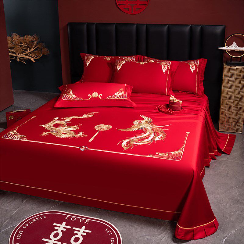 婚庆结婚大红色女方床单单件酒店被单枕套三件套刺绣接亲出嫁