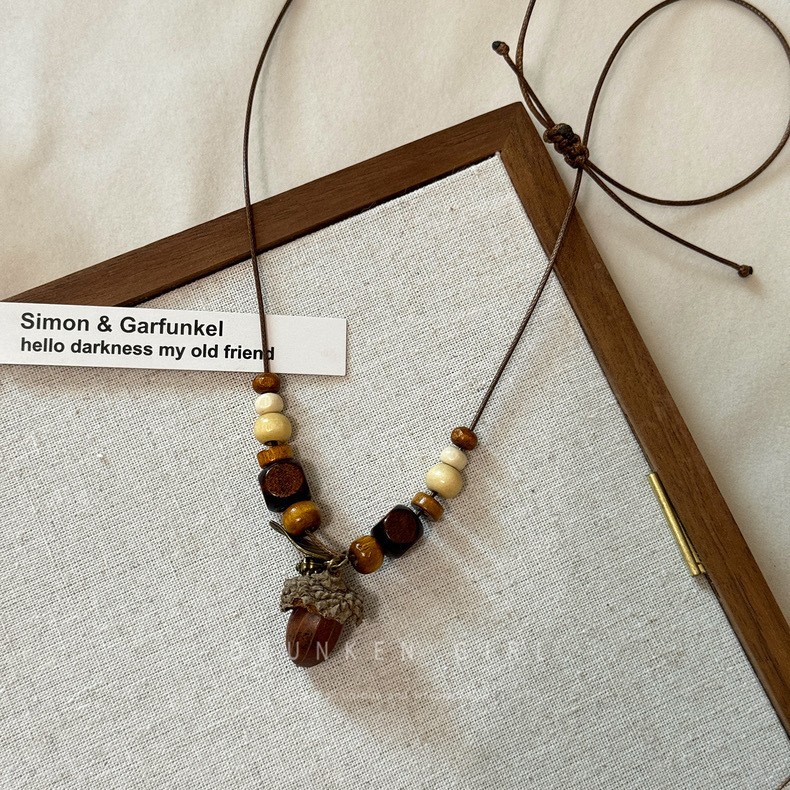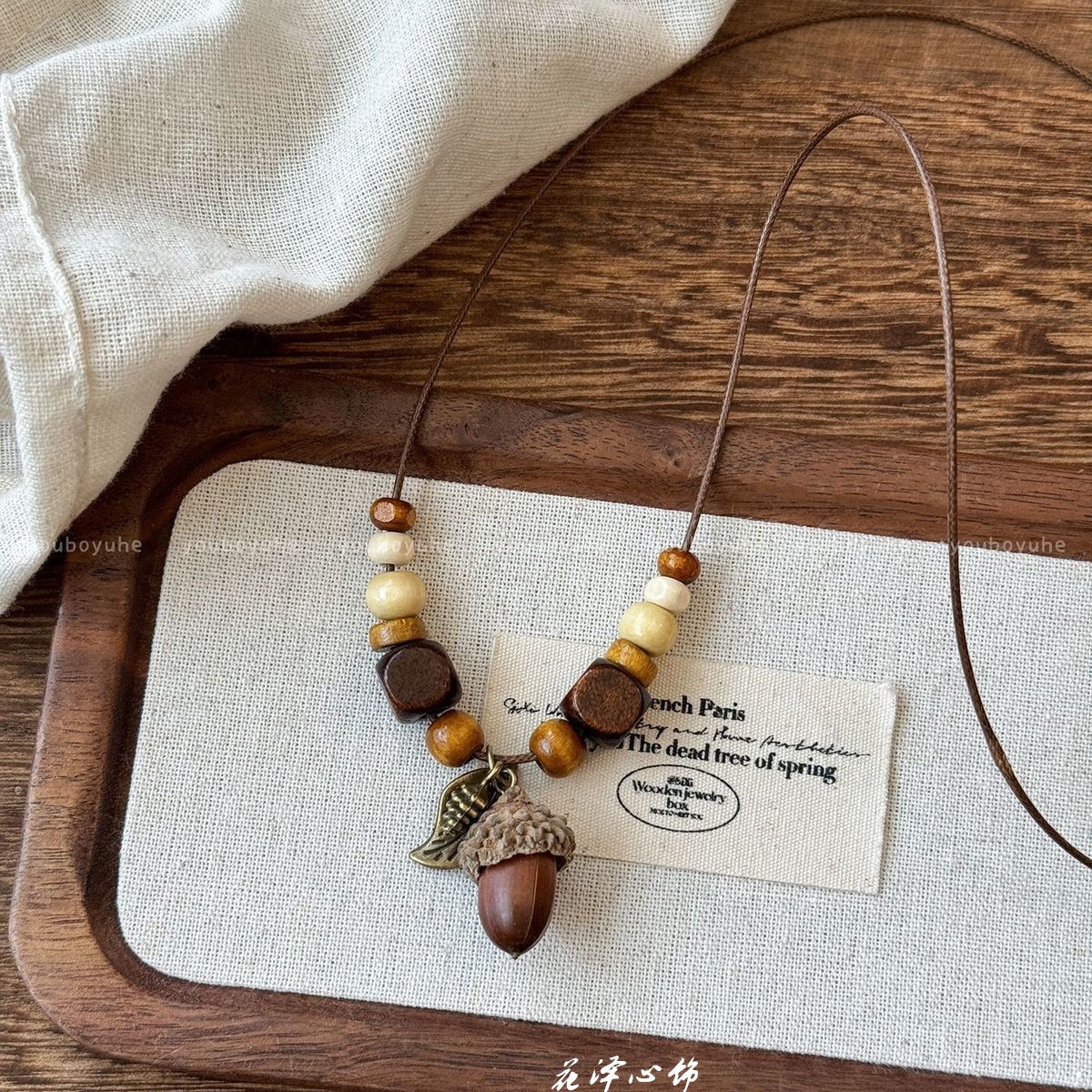 复古橡果吊坠国潮项链女款禅意复古民族风串珠锁骨链长款毛衣链