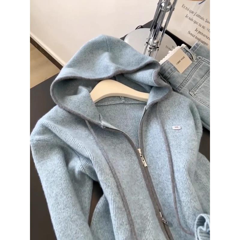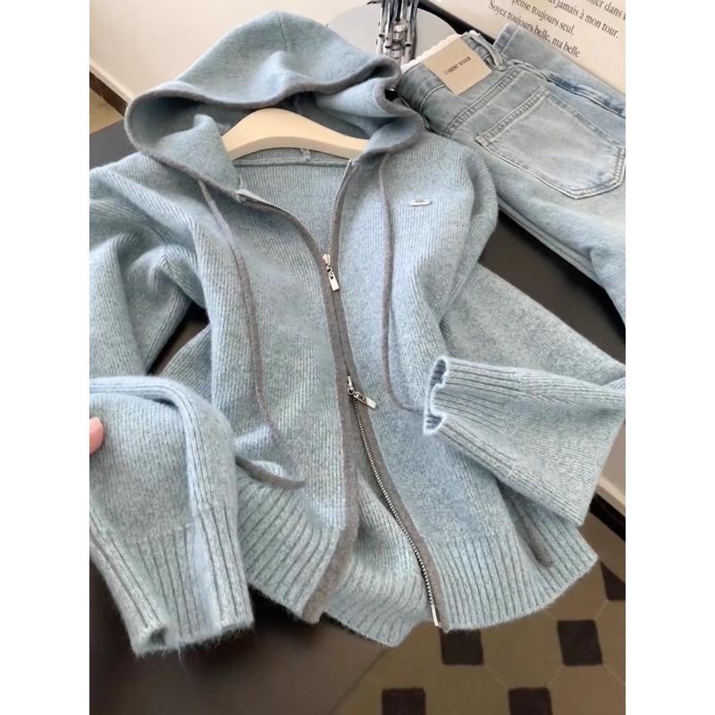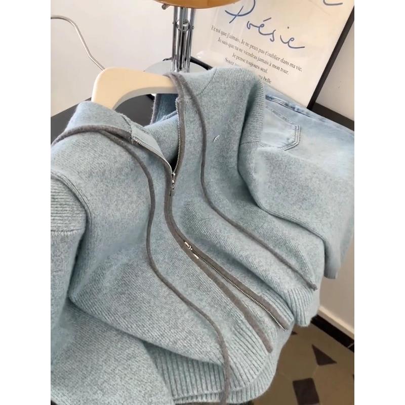 韩系软糯风宽松连帽针织开衫女2025秋季新款双拉炼高级感毛衣外套