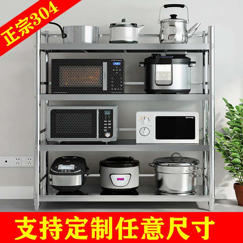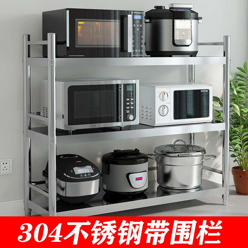 304不锈钢厨房置物架4三层带围栏落地架子微波炉架储物收纳架锅架