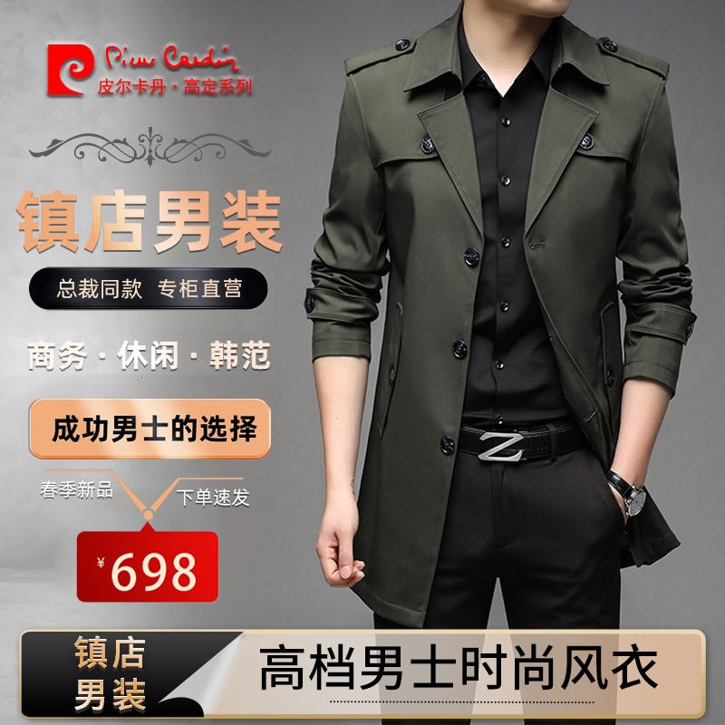 皮尔卡丹春秋季高档男士时尚潮流中长款风衣修身商务韩版翻领外套