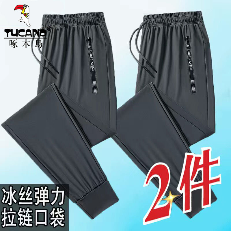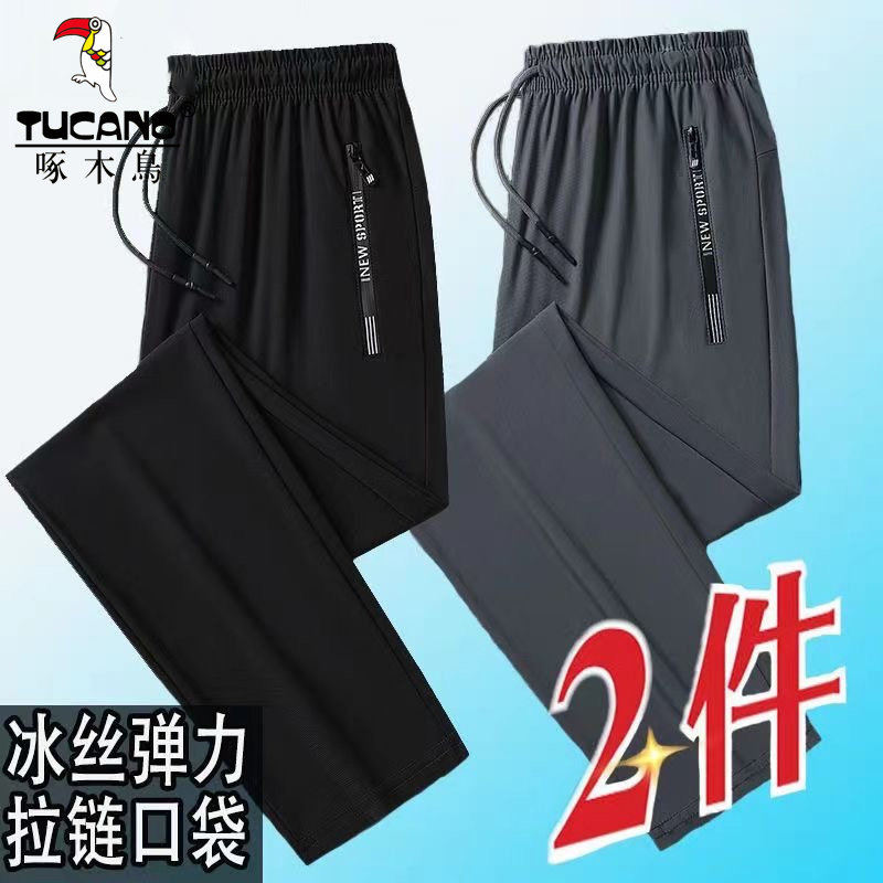 啄木鸟冰丝速干透气裤子男士弹力宽松大码休闲直筒裤跑步运动长裤