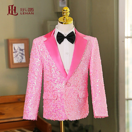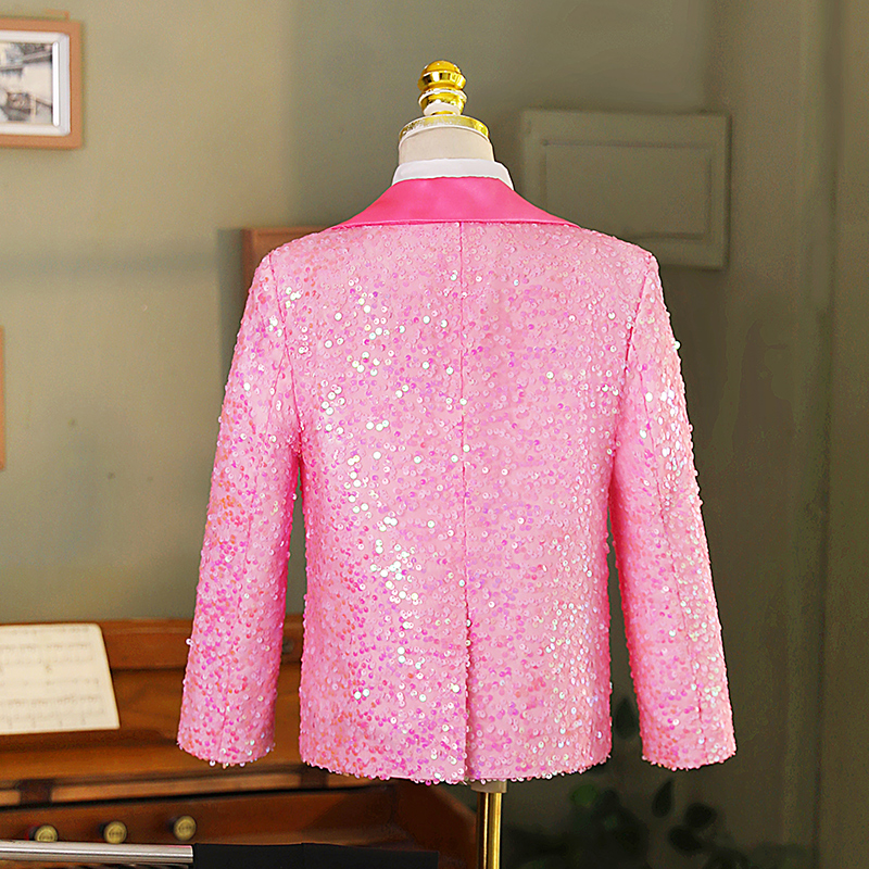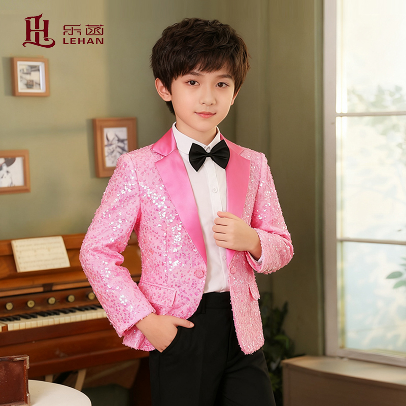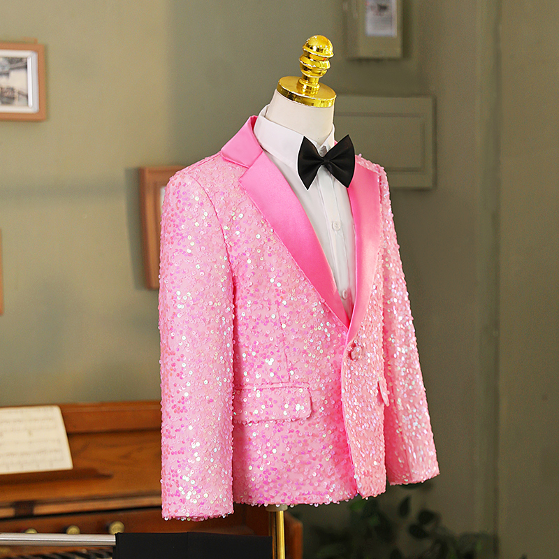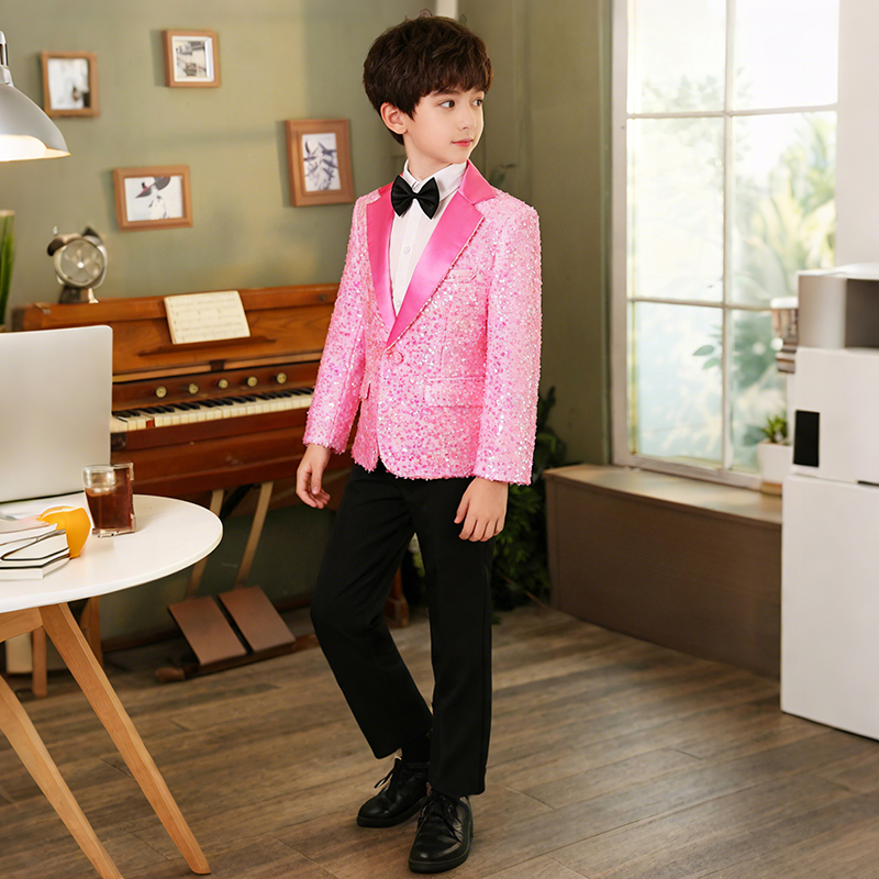 男童炫彩演出服儿童亮片礼服西装主持人亮粉男童歌唱粉色礼服套装