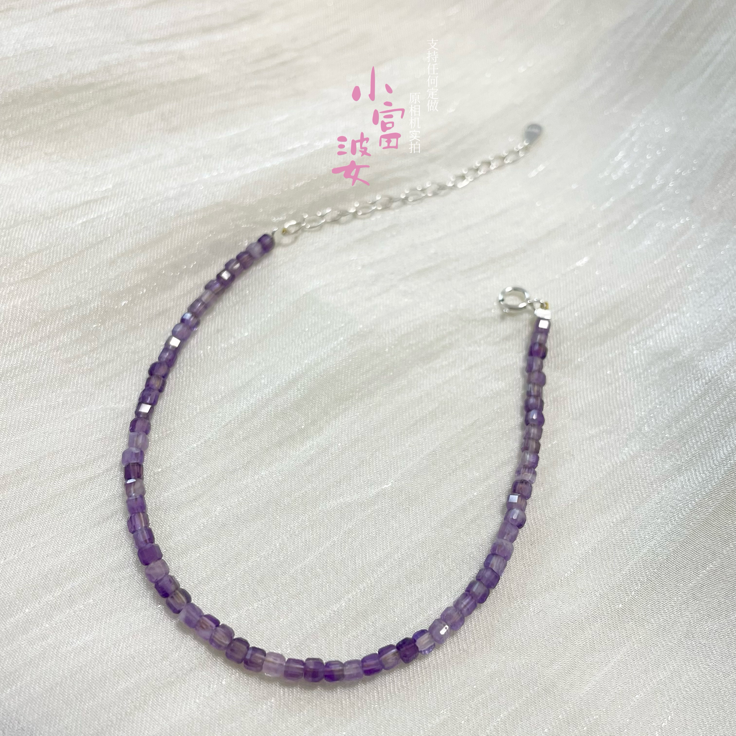 梦幻薰衣草紫水晶轻奢素圈手链天然石小方块淡色显白银手串可调节