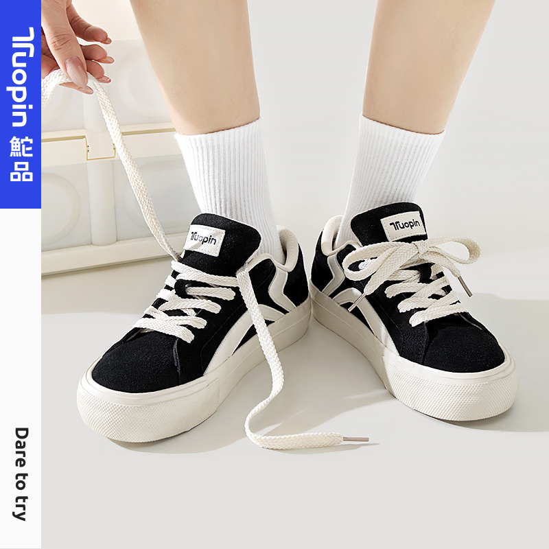 鮀品黑色板鞋女2025秋季新款厚底增高休闲女鞋子百搭学生运动鞋女