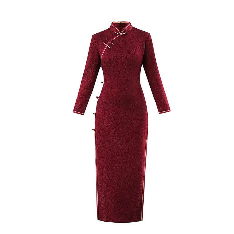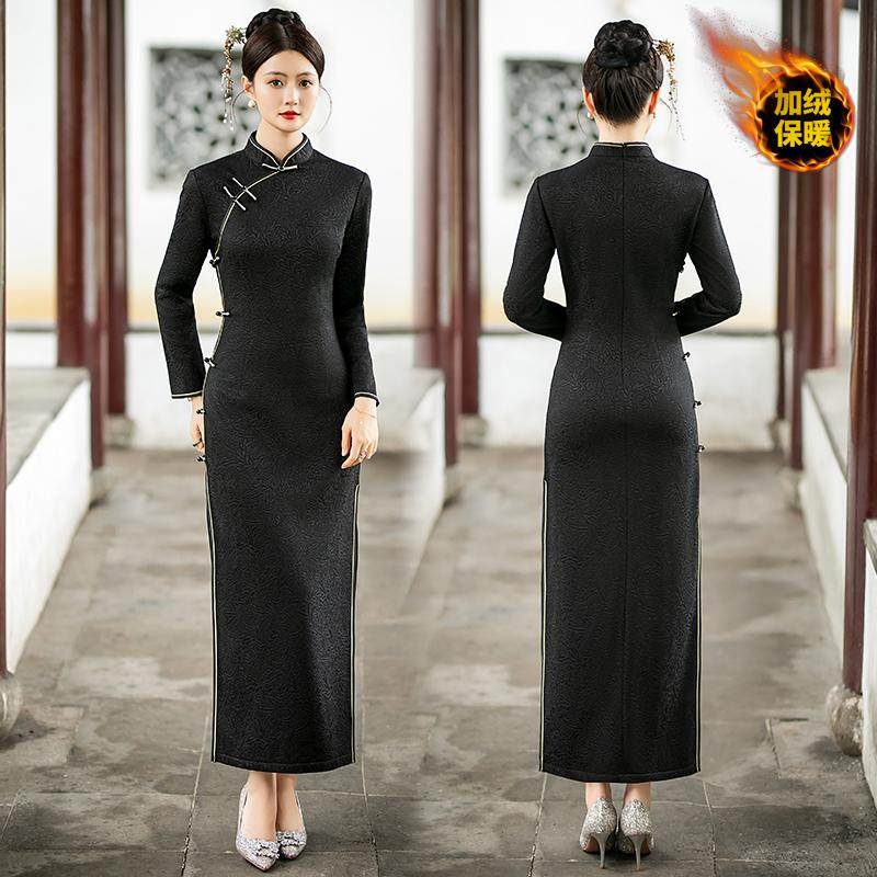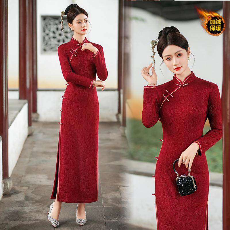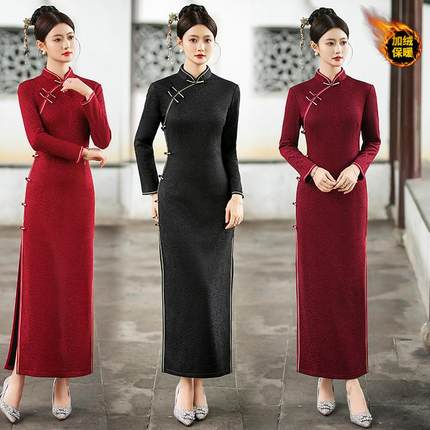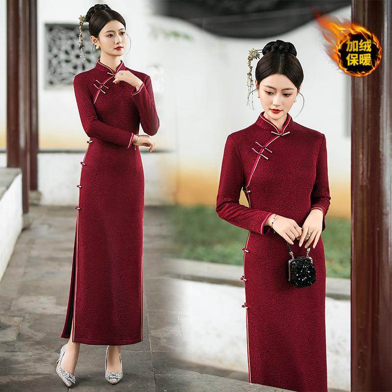加绒加厚旗袍喜婆婆秋冬日常长款连衣裙优雅复古大码婚宴礼服修身