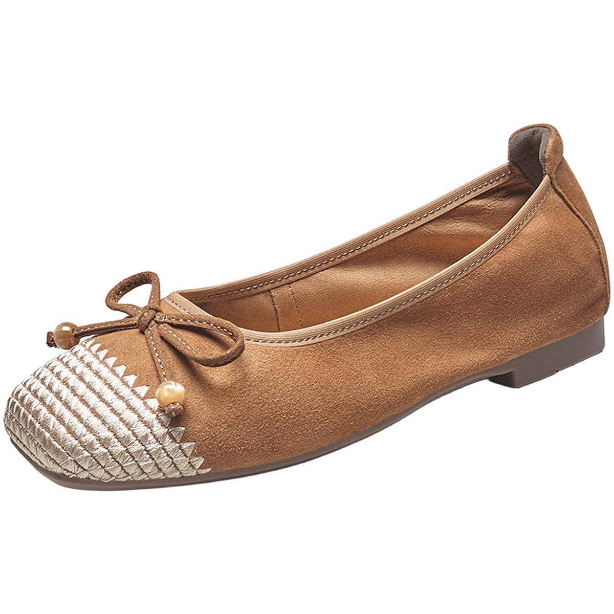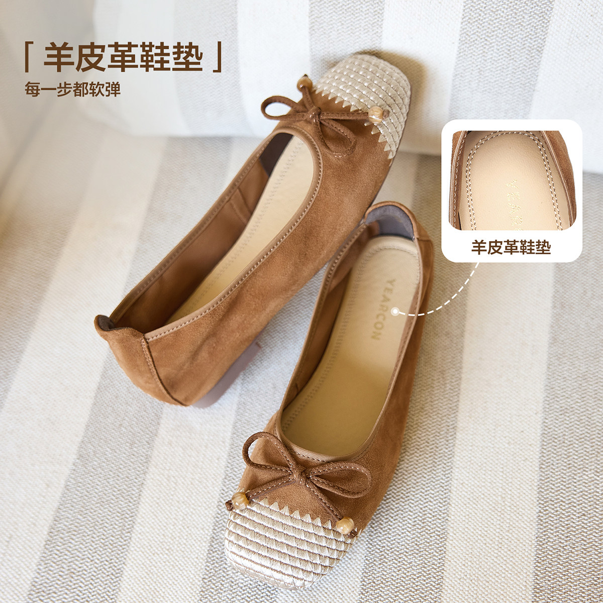 意尔康舒适羊皮单鞋女2026春季新款浅口蝴蝶结串珠通勤豆豆鞋船鞋