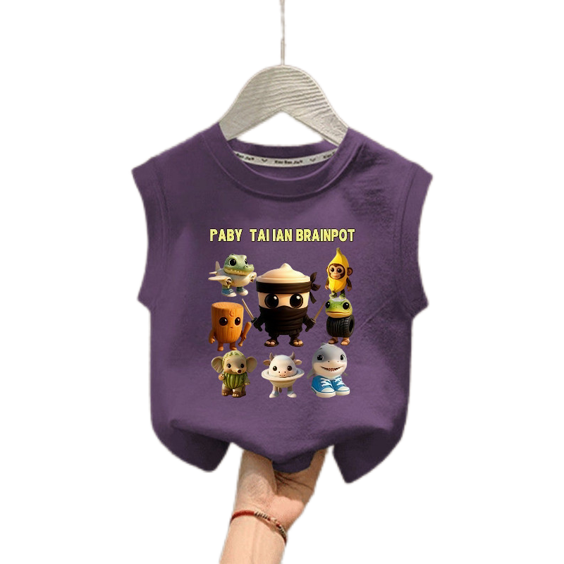 国外山海经新款卡通夏男童木棍女童T恤纯棉无袖背心儿童宝宝外穿t