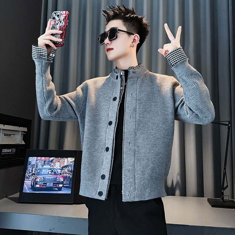 秋冬社会小伙假两件毛衣青年小码开衫男针织衫XS码矮个子修身线衣