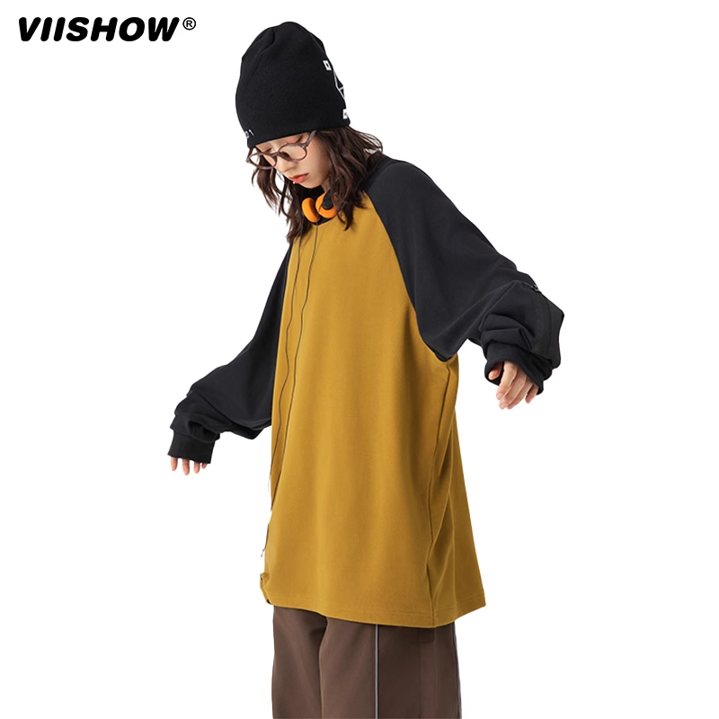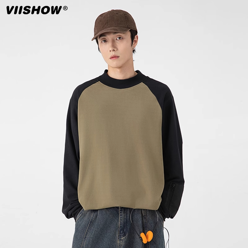 VIISHOW冬新款拼接撞色插肩袖长袖T恤打底衫男日系少年感圆领毛衣