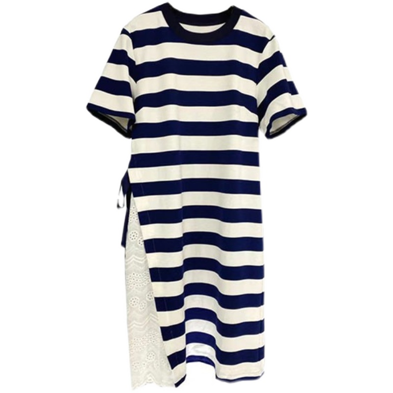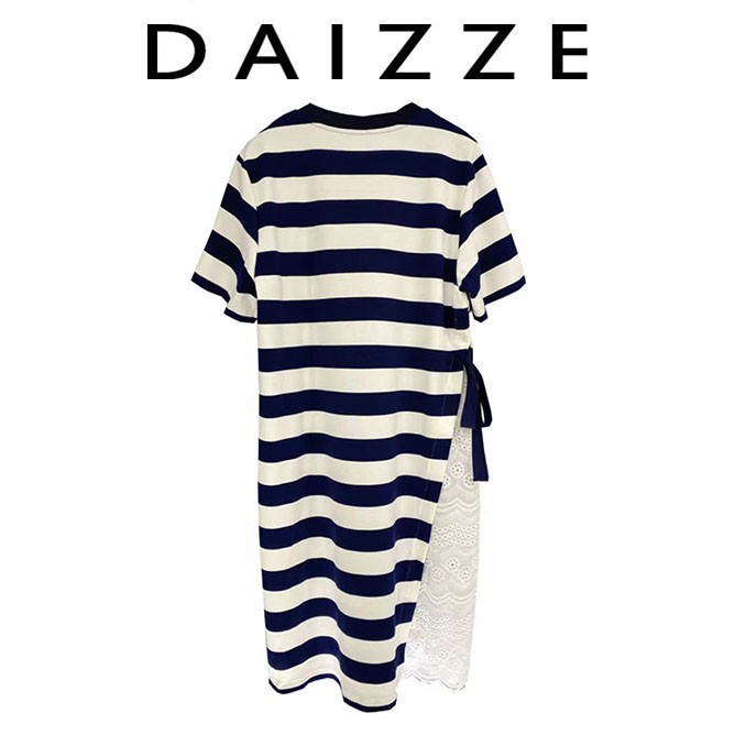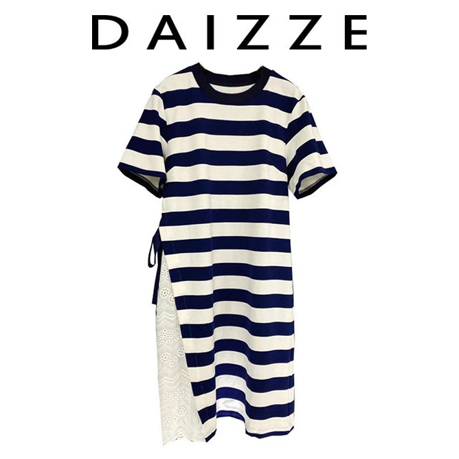 DAIZZE~2023夏季新款时尚宽松侧边系带拼接条纹套头短袖连衣裙女