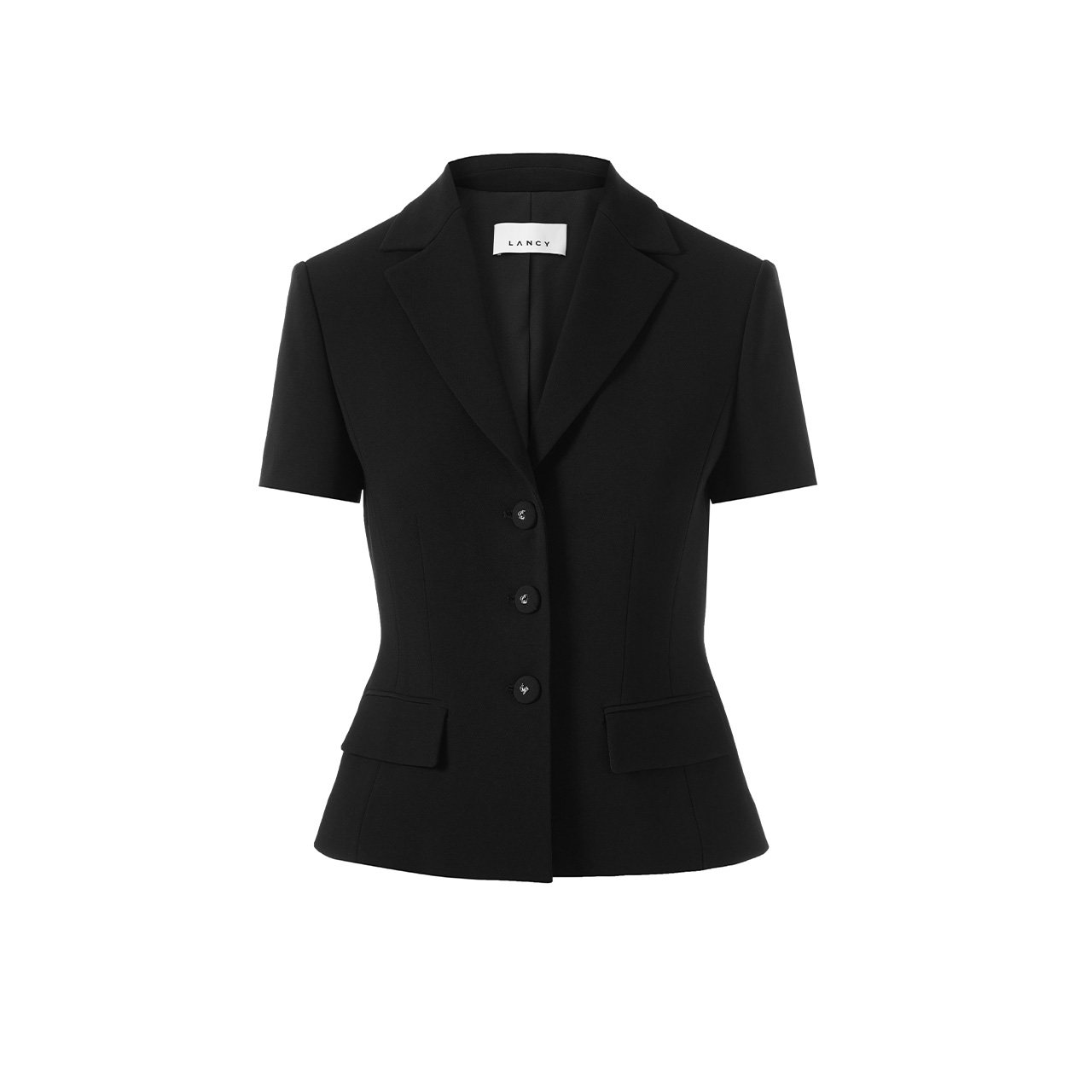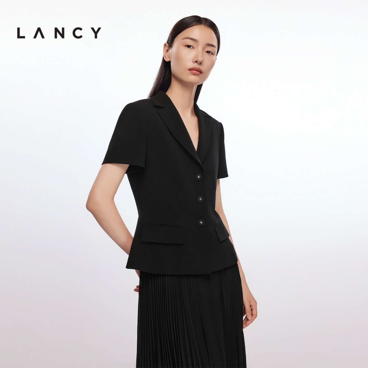 LANCY/朗姿2025夏新款气质通勤收腰短袖短款三醋酸西装外套黑色女