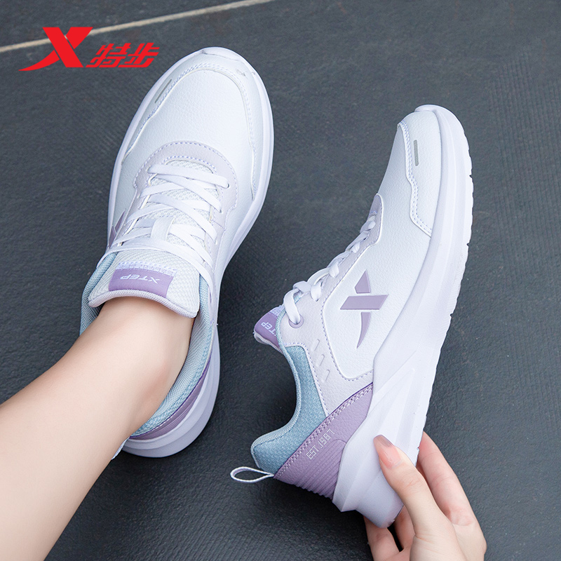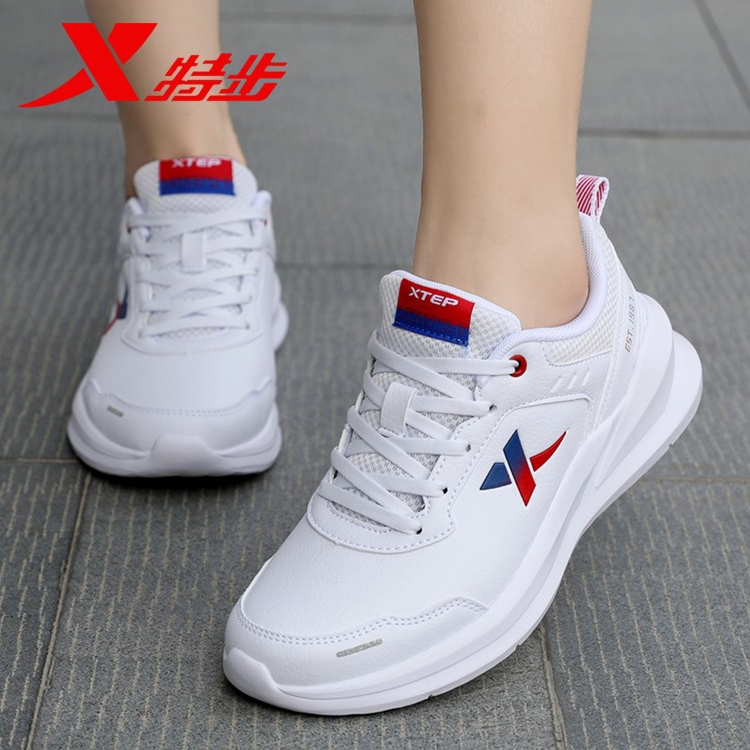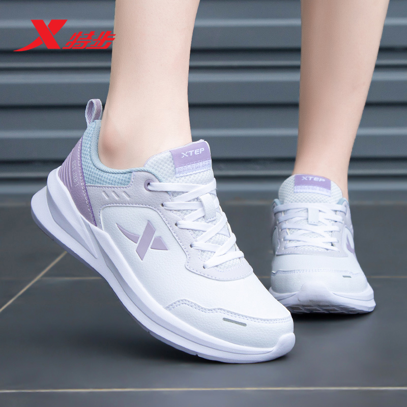 特步女鞋皮面防水运动鞋女款秋冬新款白色休闲鞋子官方旗舰跑步鞋
