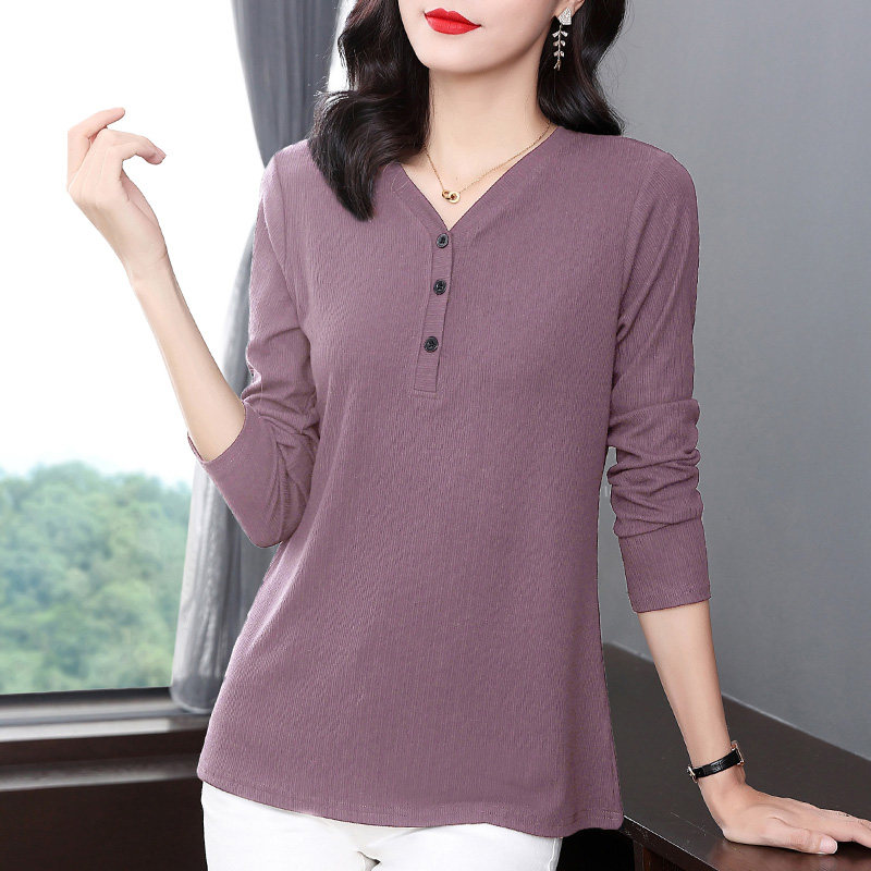 纯棉长袖t恤女装2024春秋新款时尚v领上衣大码胖mm显瘦遮肉打底衫