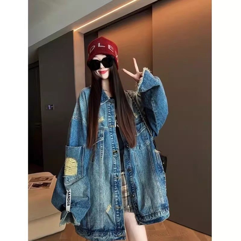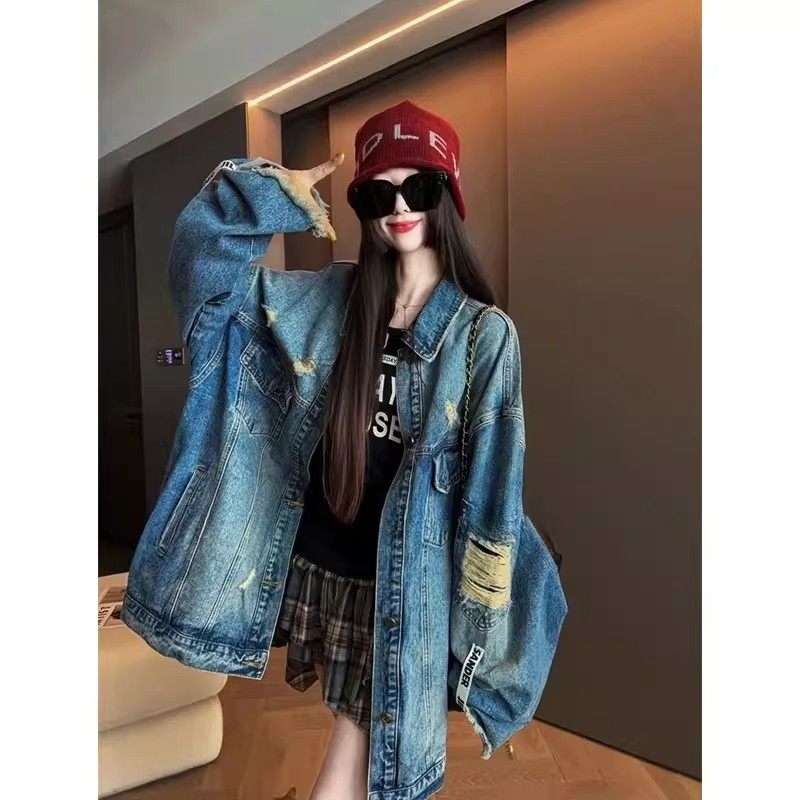 大码300斤美式复古做旧破洞牛仔外套男女秋冬设计感宽松翻领上衣