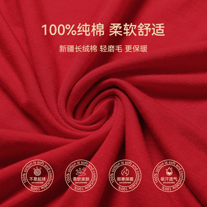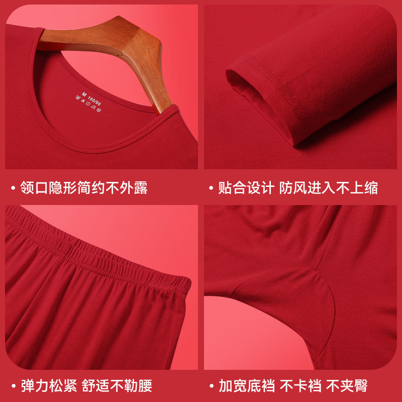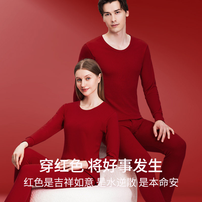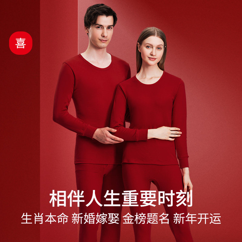 本命年大红色保暖内衣套装女秋冬情侣新婚结婚蛇年男秋衣秋裤加厚