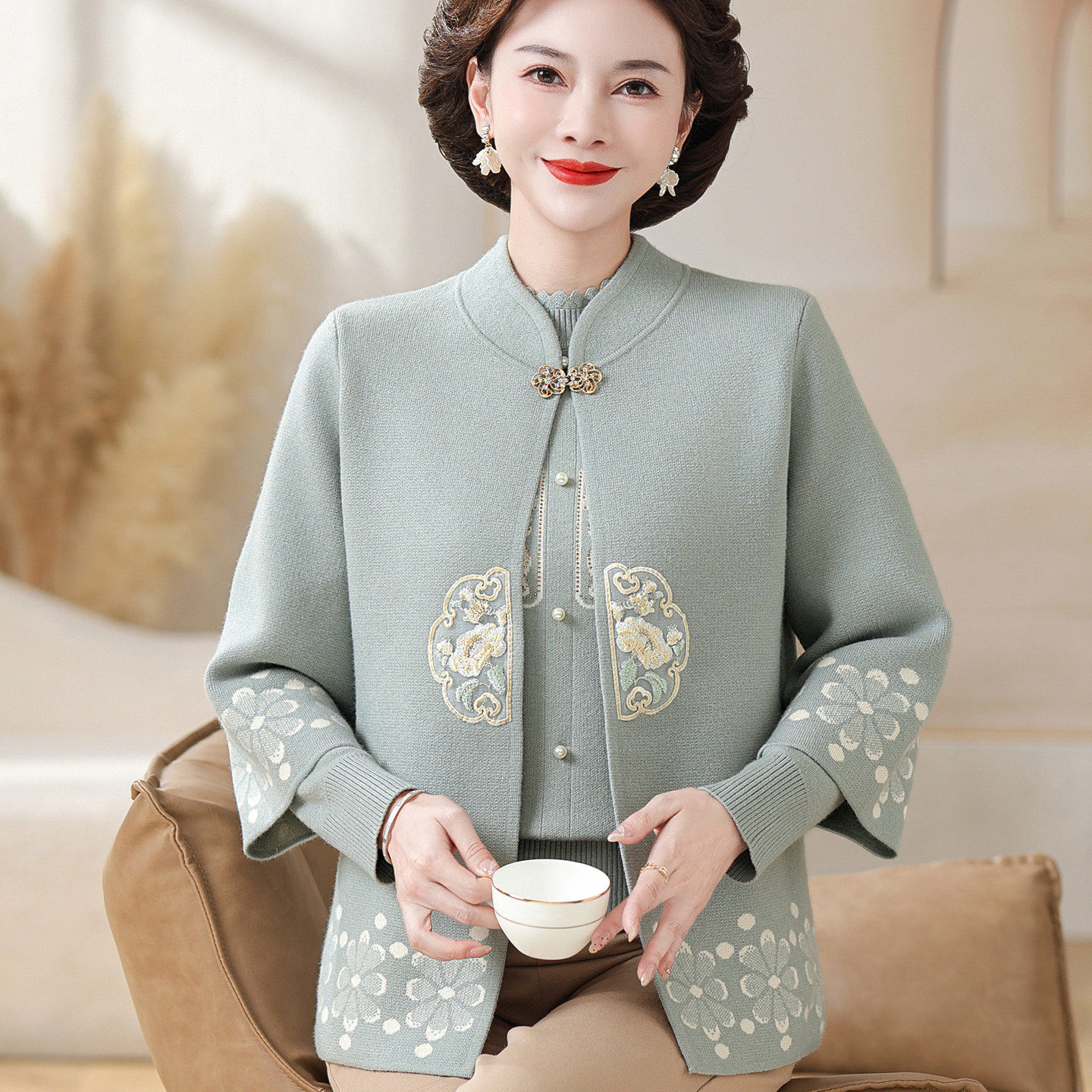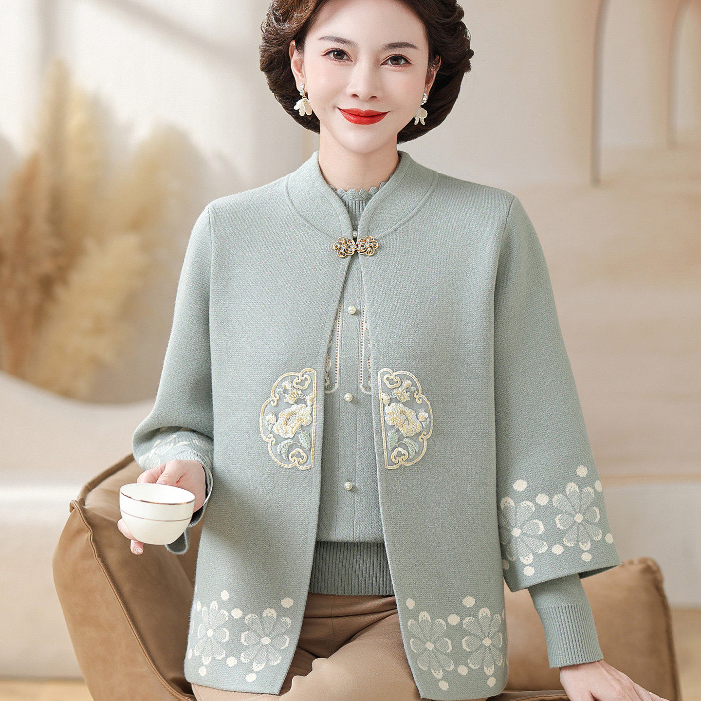 2025新中式妈妈秋装针织两件套中老年女秋冬国风毛衣时尚开衫外套