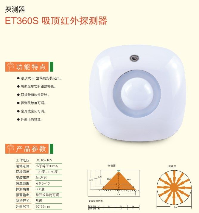 上海ET360S有线红外探测器吸顶式红外探头防盗入侵报警器