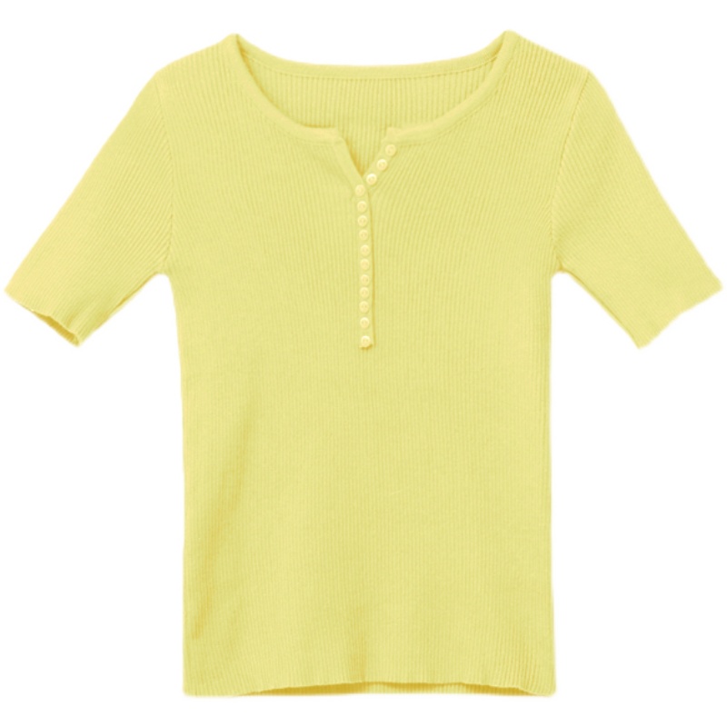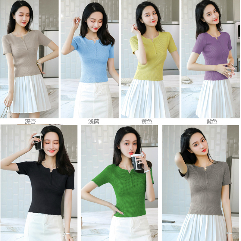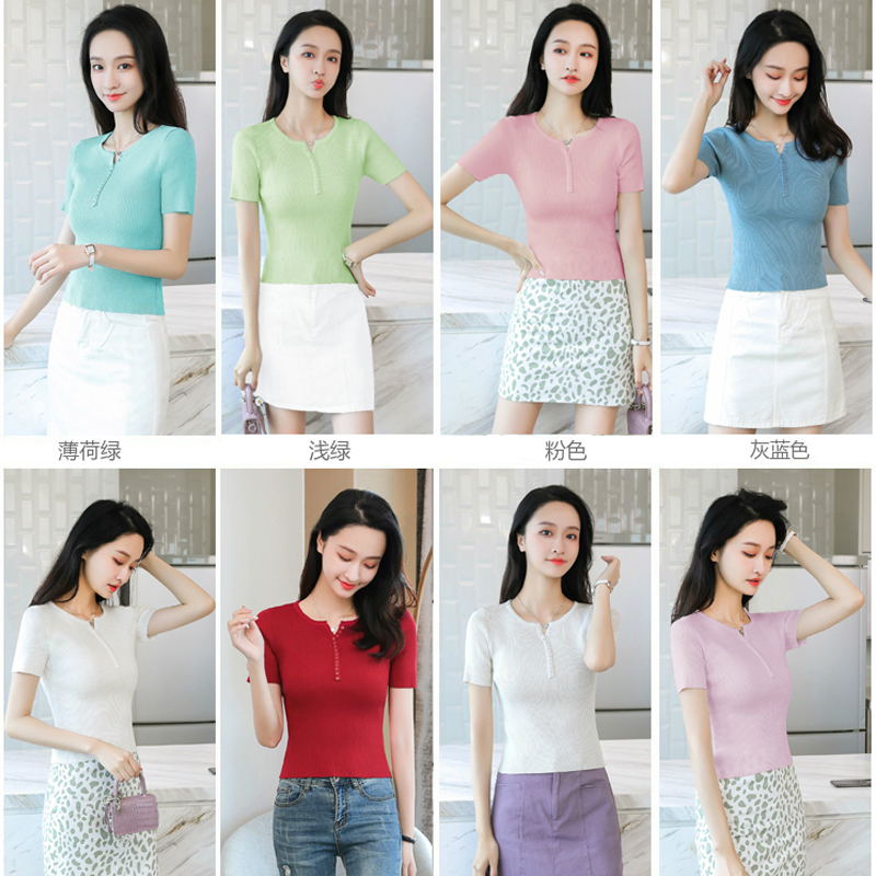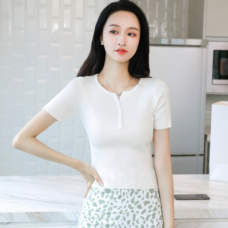 冰丝短袖t恤女修身夏季薄款针织衫 小个子气质短款配半身裙的上衣