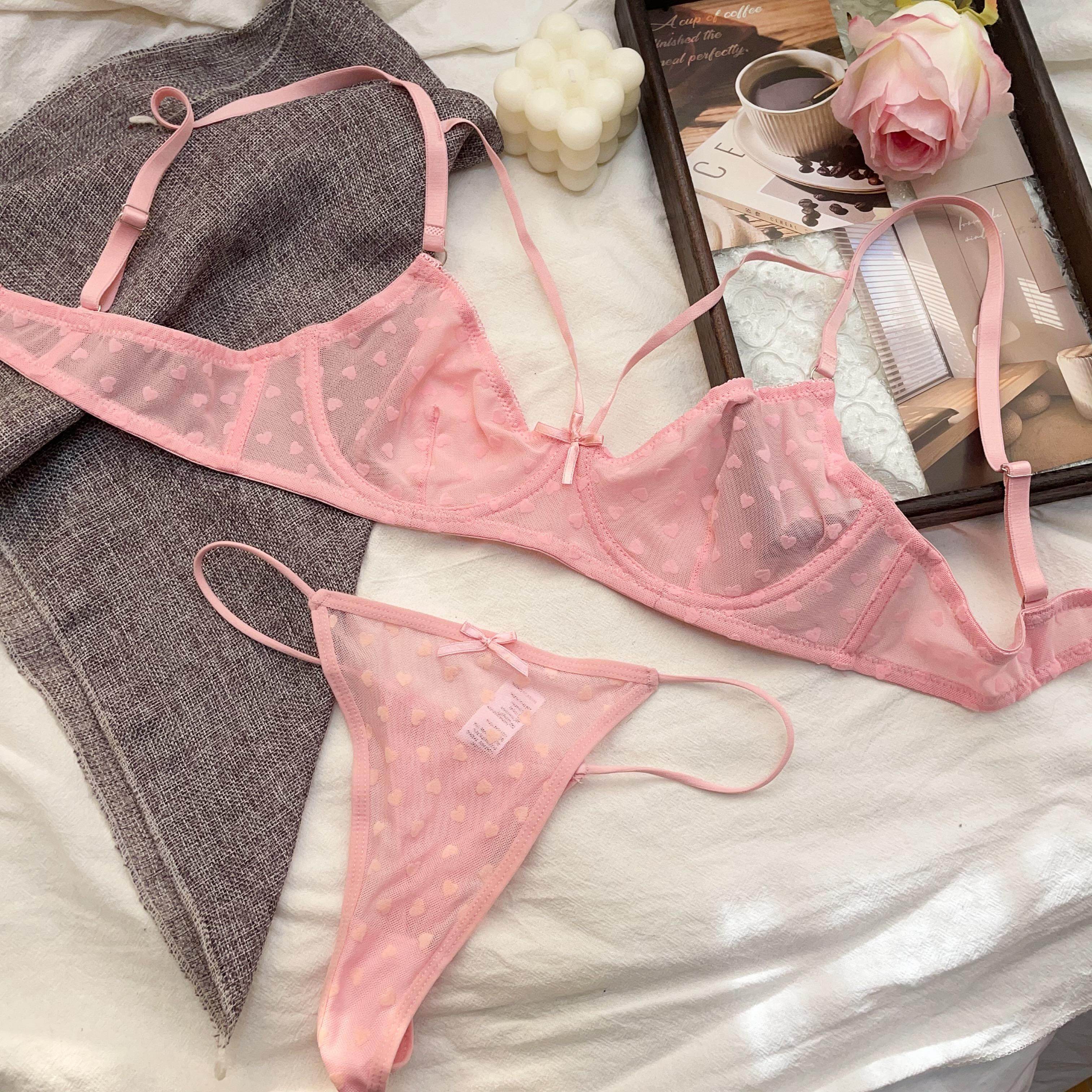 粉红性感植绒网纱文胸套装法式超薄舒适纯欲显小透明钢圈女士内衣