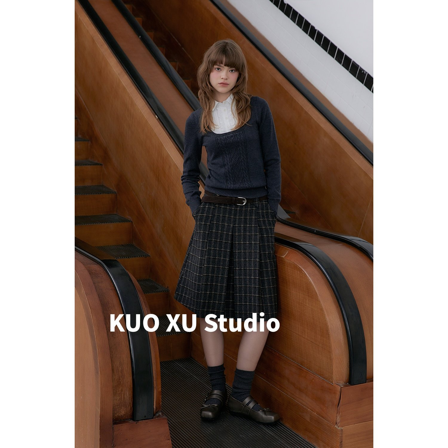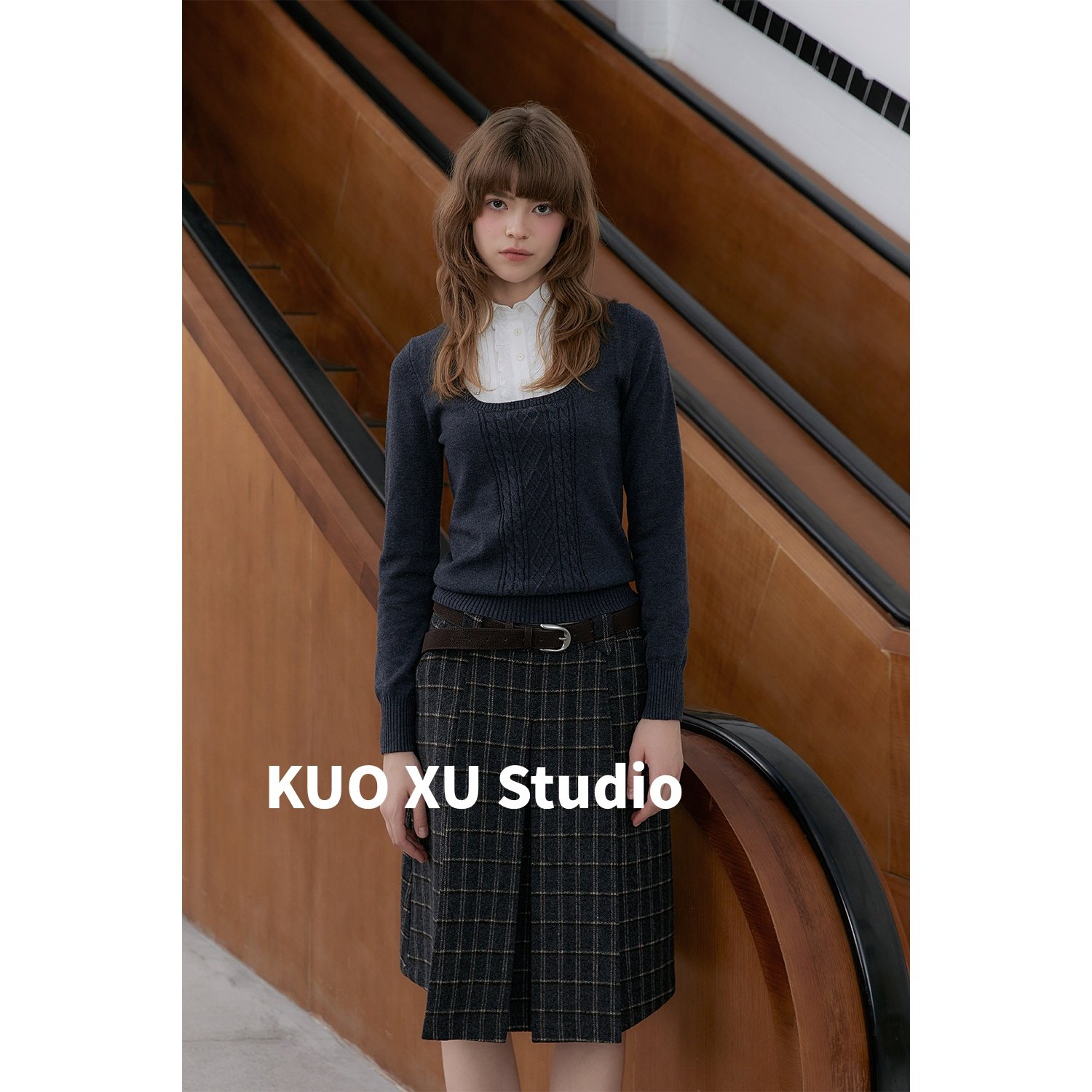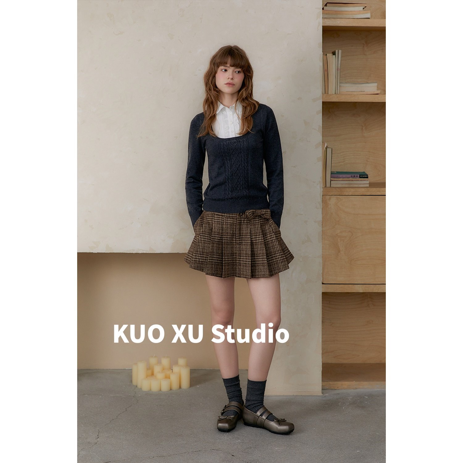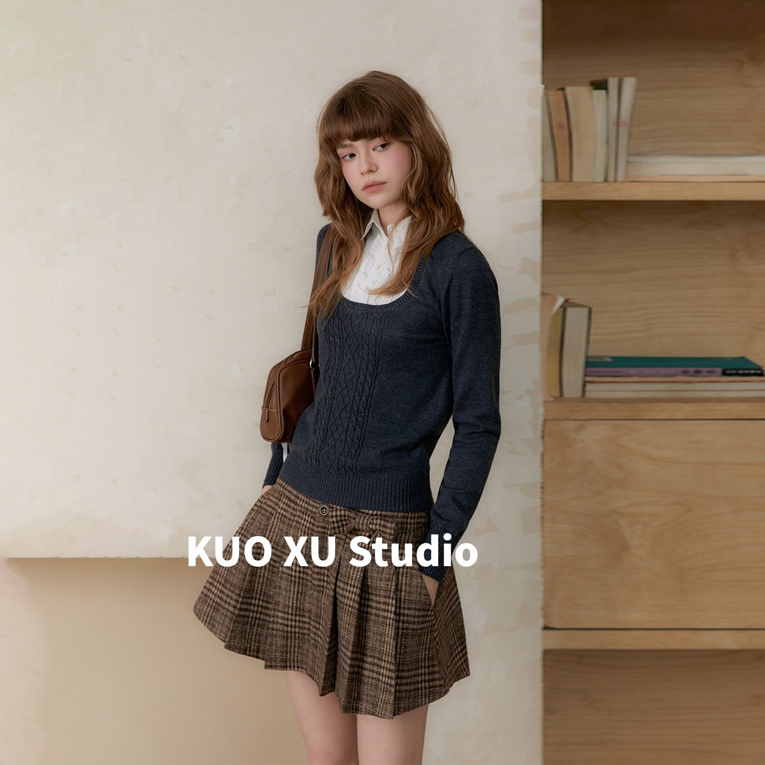 秋冬穿搭针织衫韩系拼接假两件衬衫女菱格毛衣学院风显瘦短款上衣