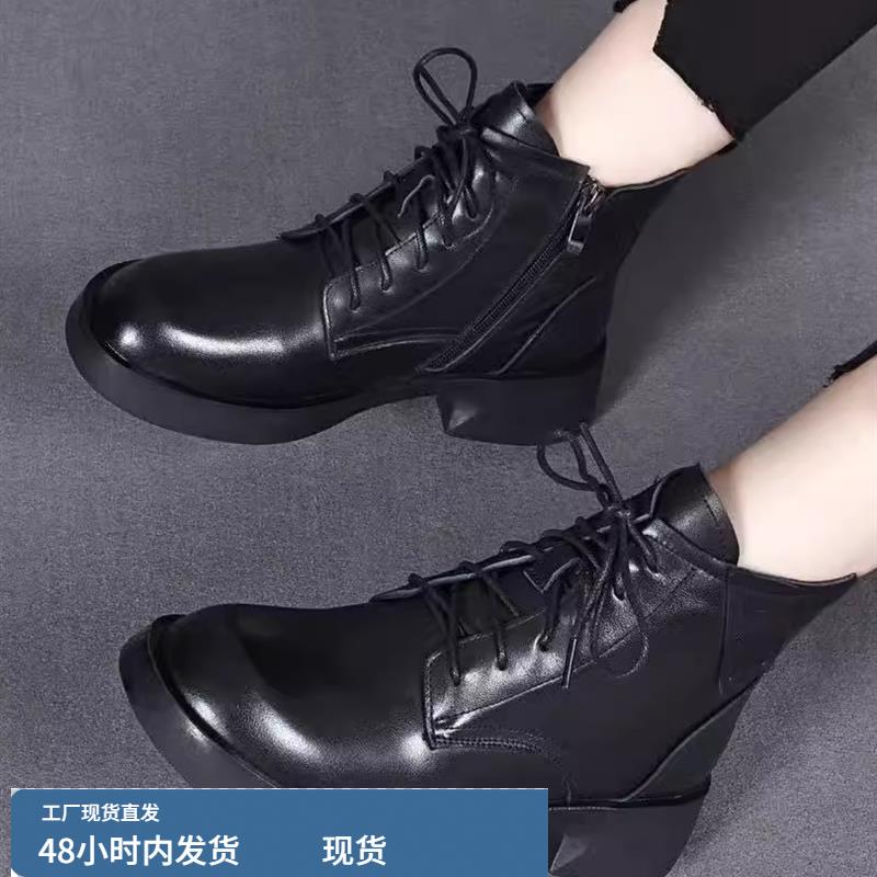 真皮圆头平跟马丁靴女2025年秋冬新款粗跟软底百搭单靴短靴女加绒