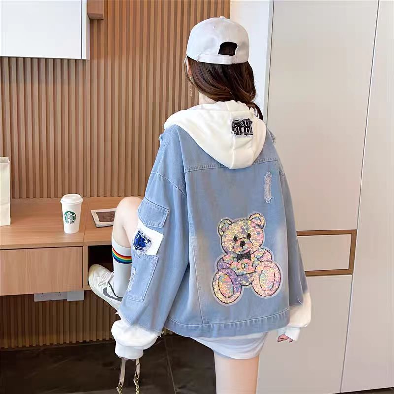 设计感假两件连帽开衫牛仔外套女春秋新款初高中学生宽松韩版上衣