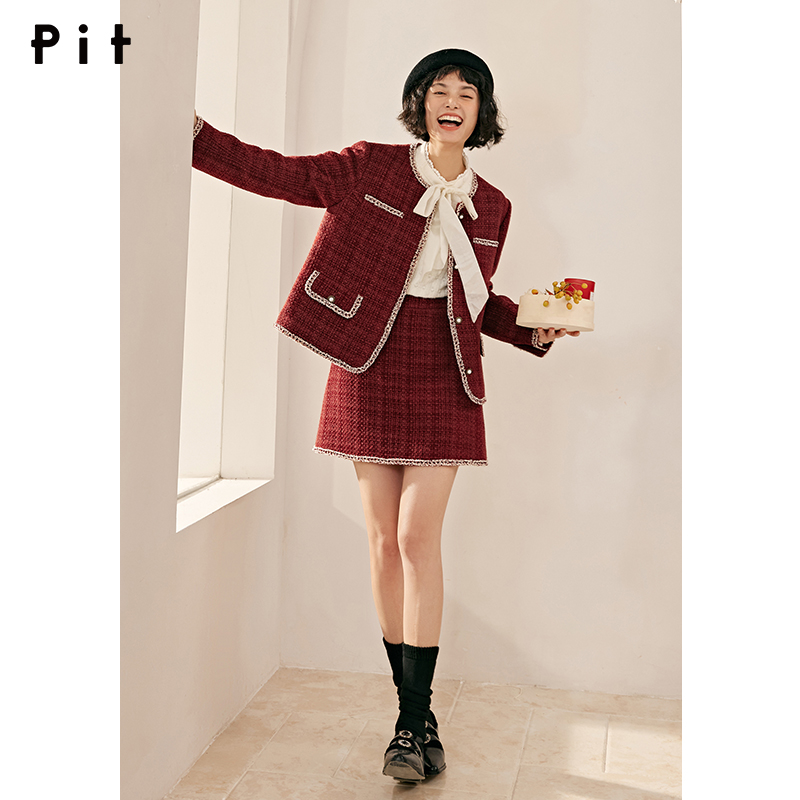 PIT法式高腰显瘦红色a字半身裙女2023秋冬装新款气质小众百搭短裙