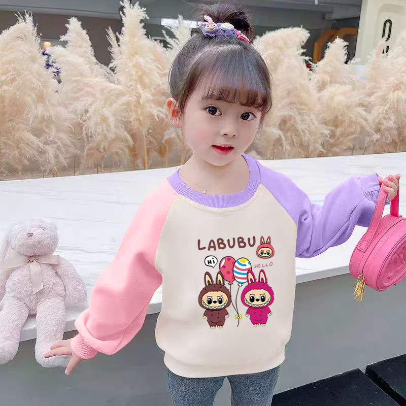 100%纯棉女童装撞色插肩长袖圆领卫衣春秋装儿童宝宝卡通洋气上衣