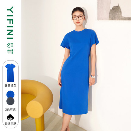 Yifini/易菲法式通勤收腰中长款圆领纯色连衣裙女夏装新款礼服裙