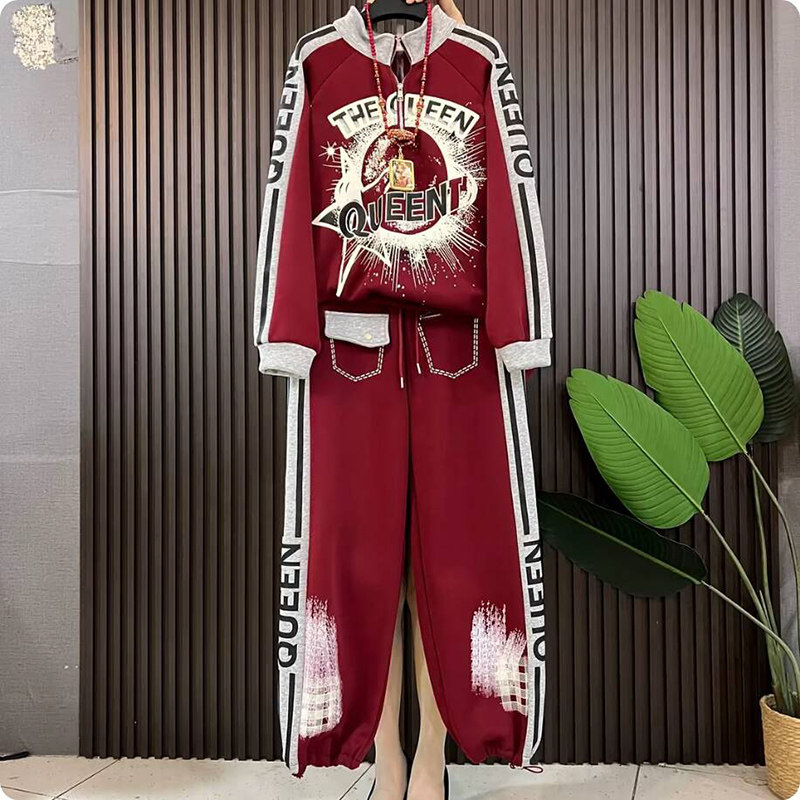 秋冬新款大码女装加绒加厚遮肉显瘦两件套胖mm印花上衣裤子套装潮