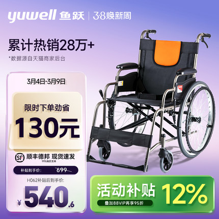 鱼跃轮椅车折叠轻便瘫痪老人专用坐便代步年轻人骨折手动推车H062