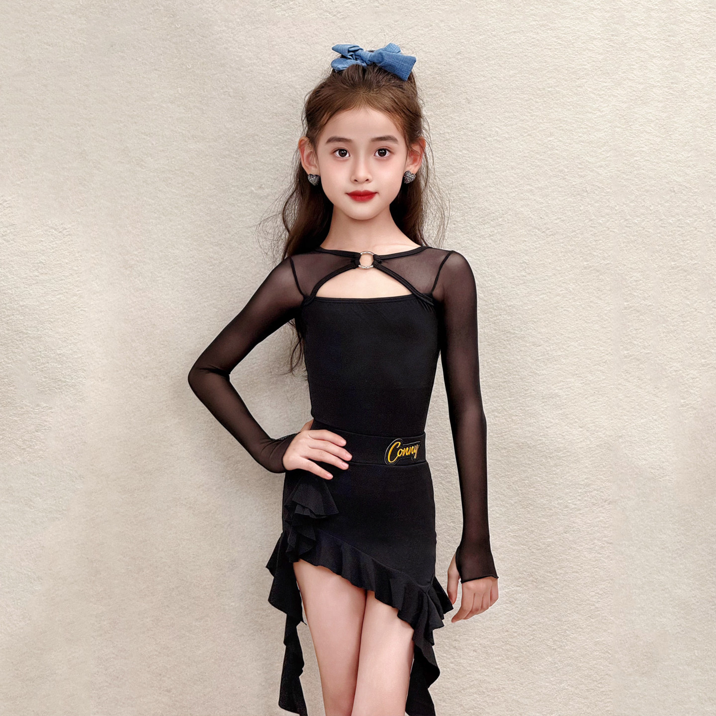 CONNY拉丁舞服女儿童舞蹈训练功服网纱长袖上衣半身裙表演出套装