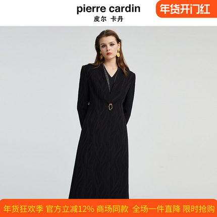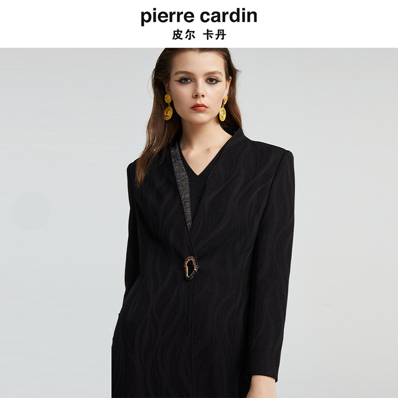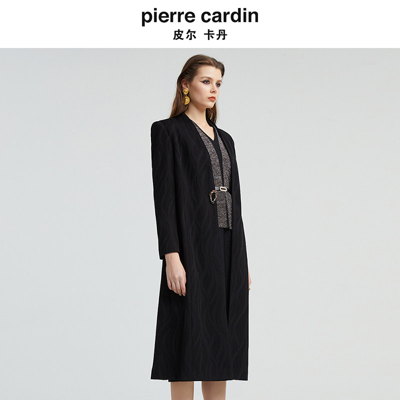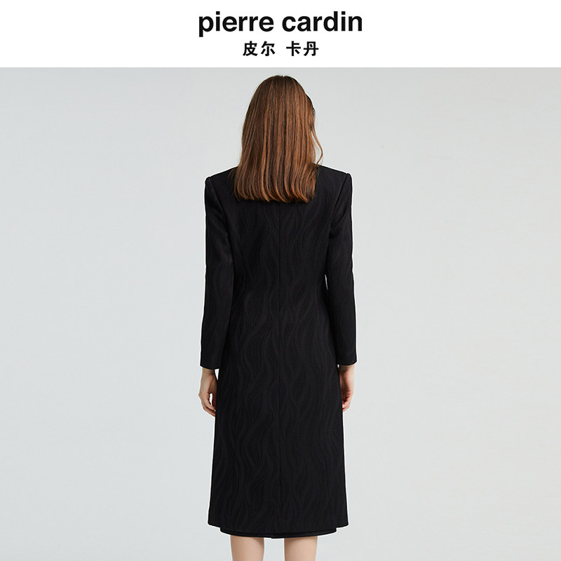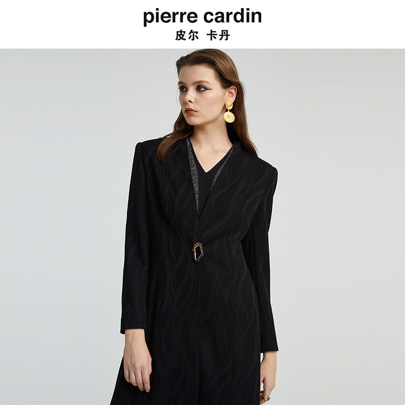 皮尔卡丹女秋季新款黑色中长款长袖风衣时尚气质外套P4355G4997B0