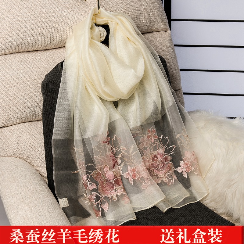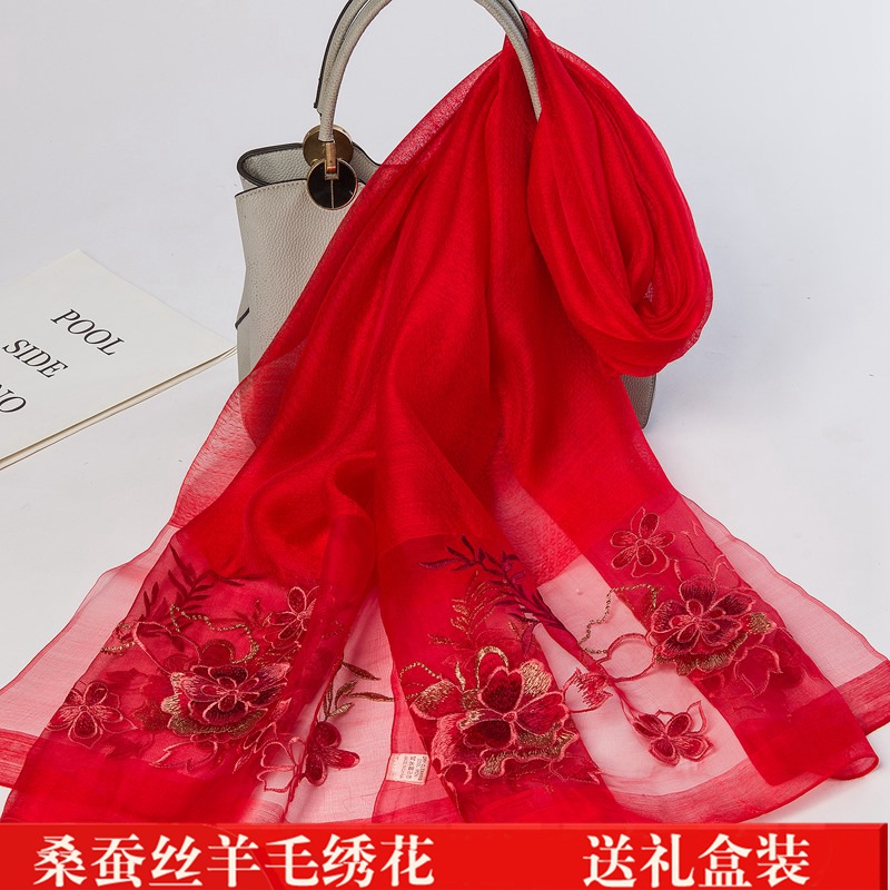 高档真丝桑蚕丝刺绣丝巾女秋冬季礼物披肩妈妈围巾送长辈