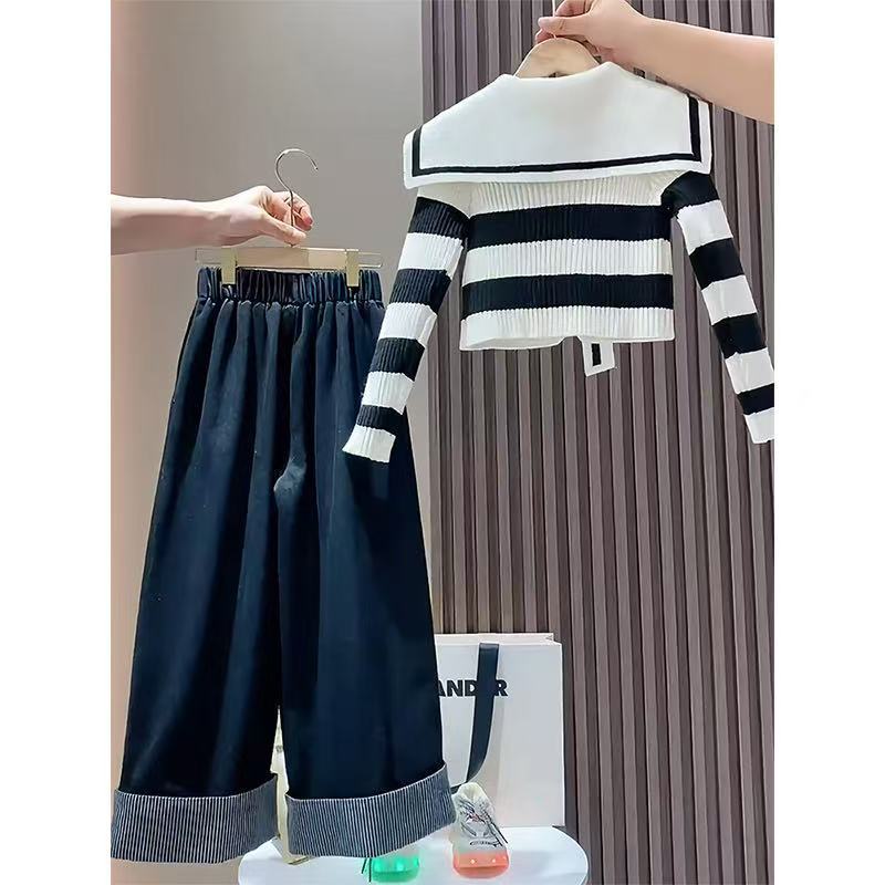 女童春秋套装2025新款韩版时尚条纹海军领毛衣阔腿裤学院风两件套
