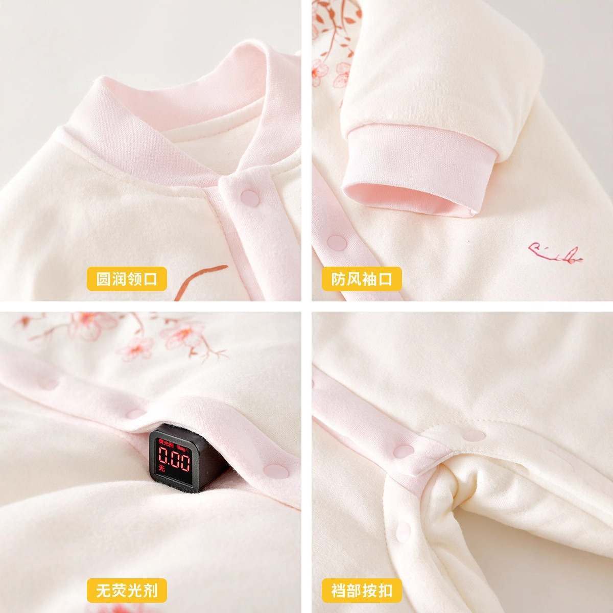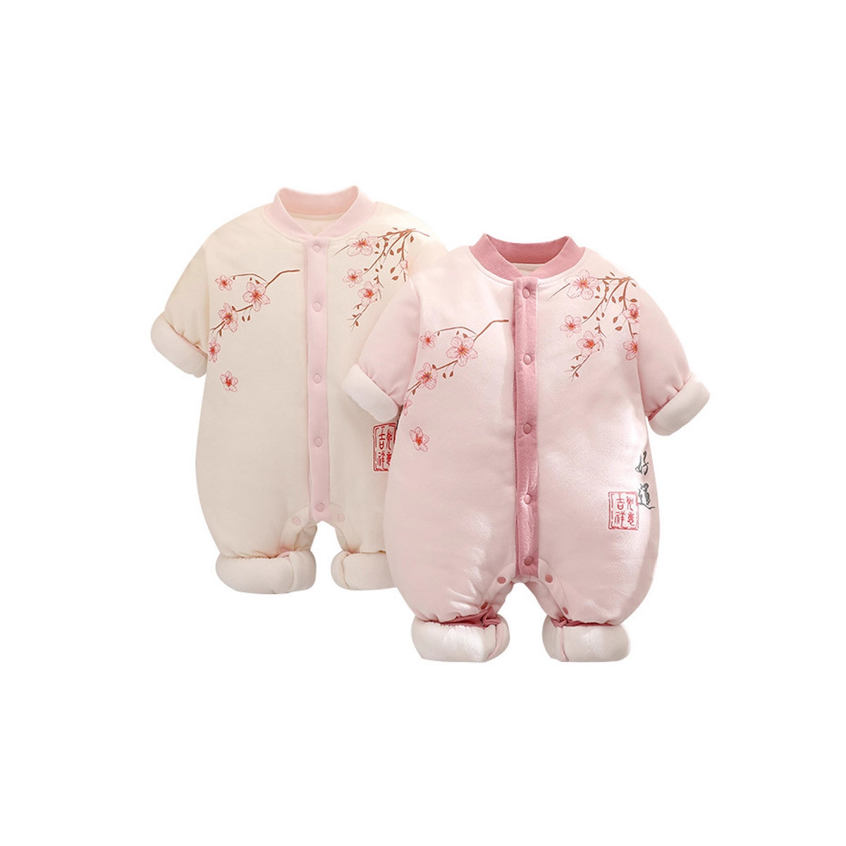 婴儿连体衣国风冬季纯棉女爬服桃花长袖卡通宝宝哈衣新生外出服
