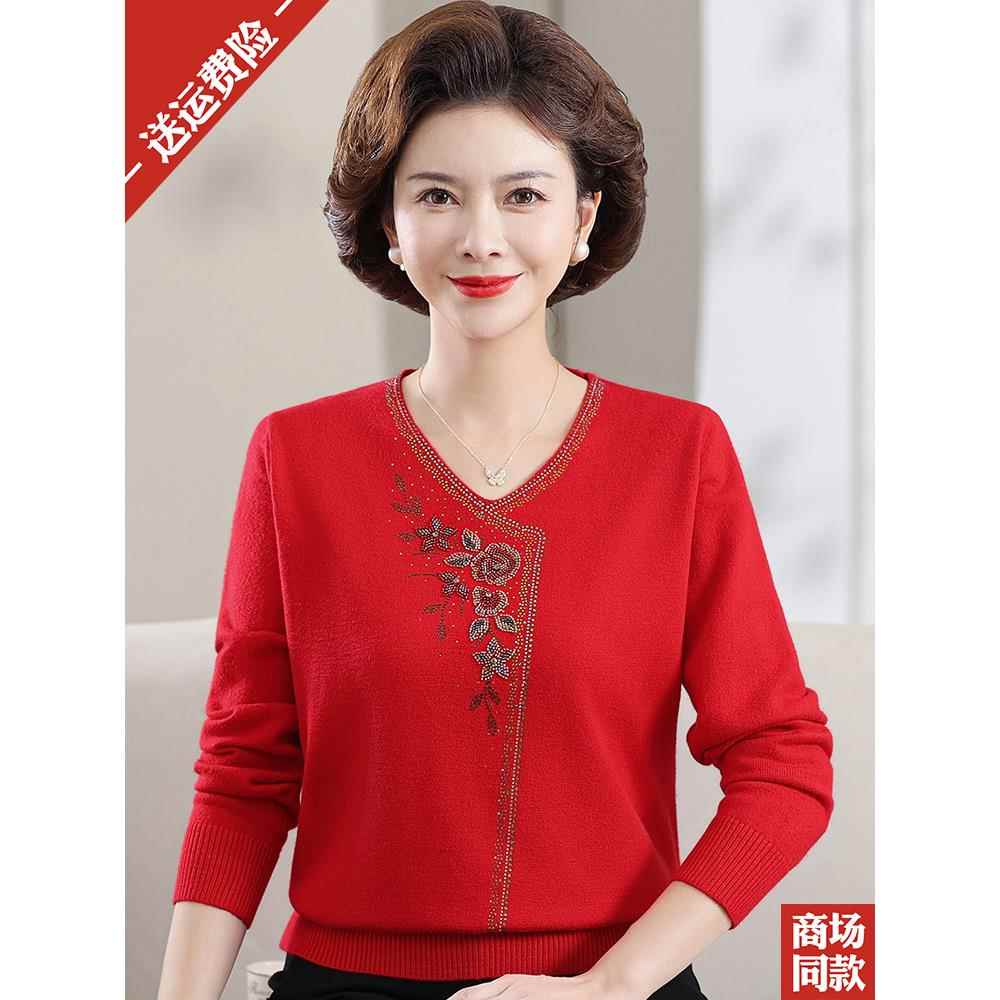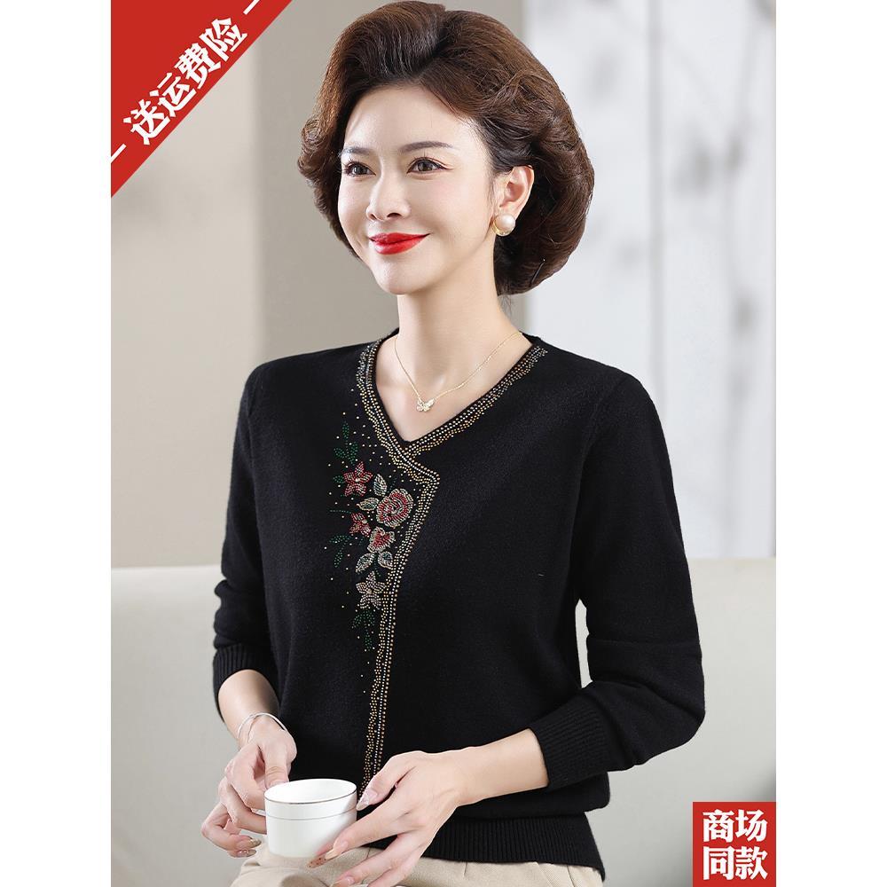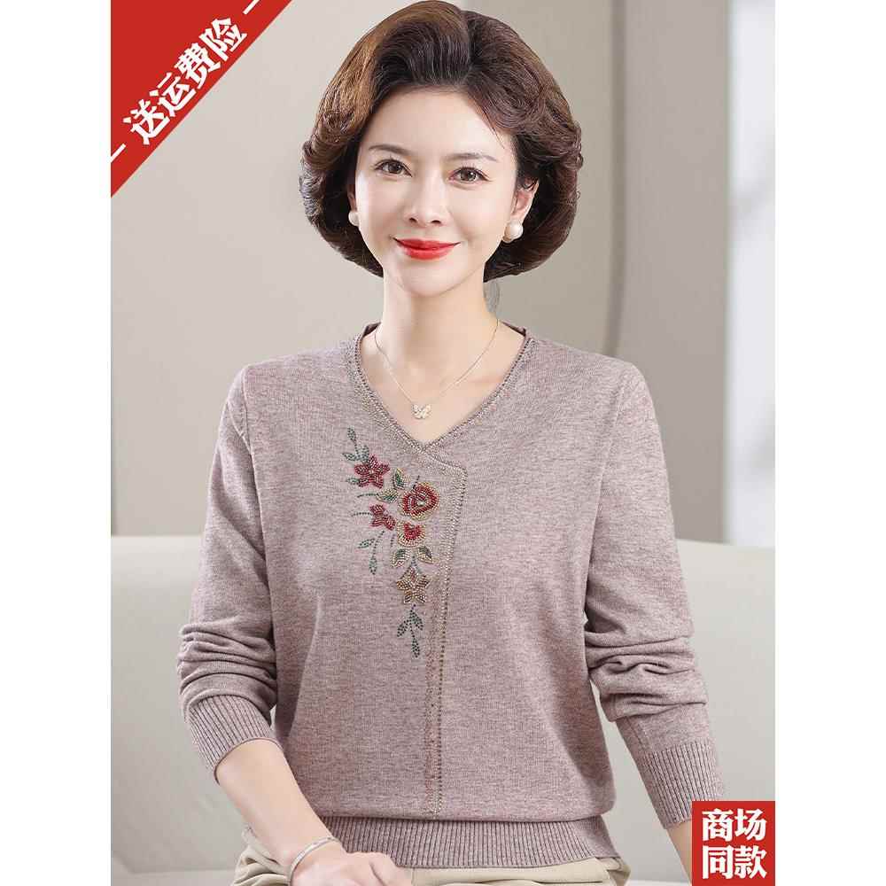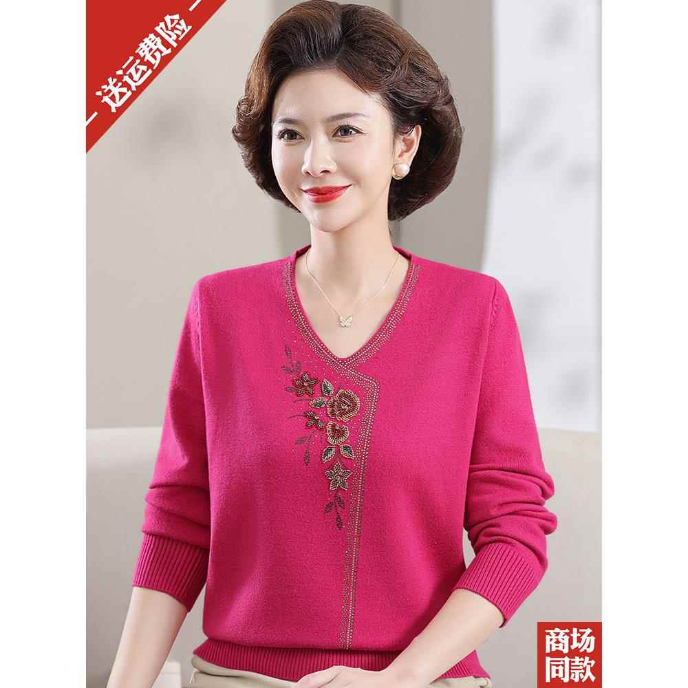中年妈妈套头女装羊毛衫2024秋冬季新款洋气V领中老年打底衫毛衣